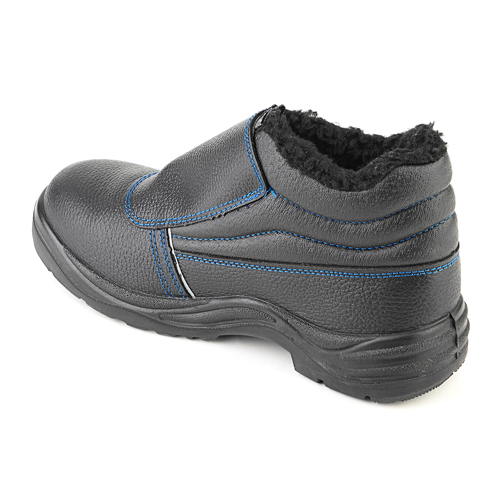 Ботинки для сварочных работ утепленные изготовлены методом литья к заготовке верха обуви промежуточного слоя подошвы из полиуретана, с ходовым слоем из резины на основе нитрильного каучука. Верх ботинок из натуральной кожи толщиной 1,8 – 2,0 мм. Подкладка ботинок из искусственного меха. В верхней части ботинок мягкий кант. Ботинки имеют защитный клапан, препятствующий попаданию искр и брызг расплавленного металла внутрь. Стелька вкладная. В носочной части внутренний защитный подносок из металла ударной прочностью 200 Дж. С боков световозвращающие элементы в виде узких полос. Rонтрастная отстрочка в тон цвета подкладки. Подошва двухслойная, МБС, ходовой слой из износостойкой, термостойкой резины на основе нитрильного каучука. Подошва выдерживает температуру 300С при контакте с нагретыми поверхностями. Есть внутренняя амортизирующая вставка в пяточной части подошвы. Глубина профиля ходового слоя подошвы 3,5 мм. Рельеф подошвы снижает риски скольжения при работе на скользких поверхностях. Цвет ботинок черный