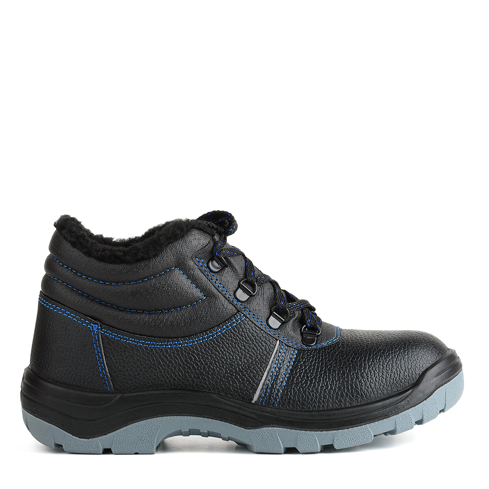 Ботинки изготовлены методом литья промежуточного слоя подошвы из полиуретана к заготовке верха обуви. На промежуточный слой из полиуретана прилит ходовой слой из полиуретана высокой плотности с повышенными антискользящими свойствами. Имеется пристроченная прилитая задинка. Верх из натуральной кожи. Подкладка ботинок из искусственного меха. В верхней части ботинок мягкий кант. Ботинки завязываются на шнурки и имеют глухой клапан. Шнуровка с использованием металлических люверсов. На глухом клапане мягкая вставка из поролона. Стелька вкладная. В носочной части стопы подносок из композитного материала ударной прочностью 200 Дж. На боковинах световозвращающие элементы в виде полосок для лучшей видимости работника. Выполнена контрастная отстрочка синего цвета в тон подкладки и цветной нити на шнурках. Подошва двухслойная, оба слоя из полиуретана разной плотности, маслобензостойкая. Есть внутренняя амортизирующая вставка в пяточной части подошвы. Глубина профиля ходового слоя подошвы 3,5 мм. Цвет ботинок черный.