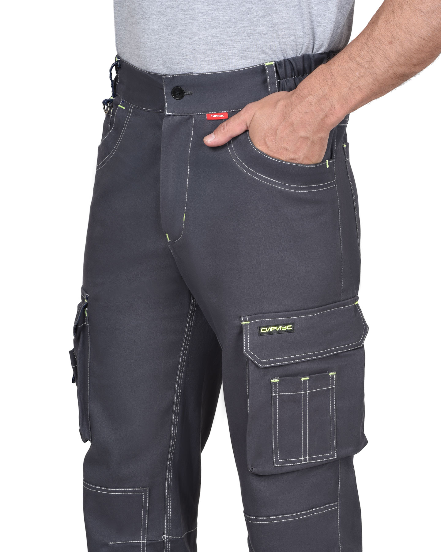 Брюки прямого силуэта с контрастной отстрочкой, с застежкой гульфика на молнию YKK и пуговицу, с карманом с фигурным входом и часовым карманом на правой половинке. На боковых швах накладные объемные карманы с фигурным клапаном на липучке. Изделие с объемными наколенниками с карманом для амортизационных накладок и застежкой на липучке по нижнему краю. Брюки с задними накладными фигурными карманами, отрезной кокеткой, с притачным поясом, частично стянутым резинкой ткацкой по боковым сторонам для лучшего прилегания. На поясе шлевки, одна из которых контрастного цвета с полукольцом для карабина.
