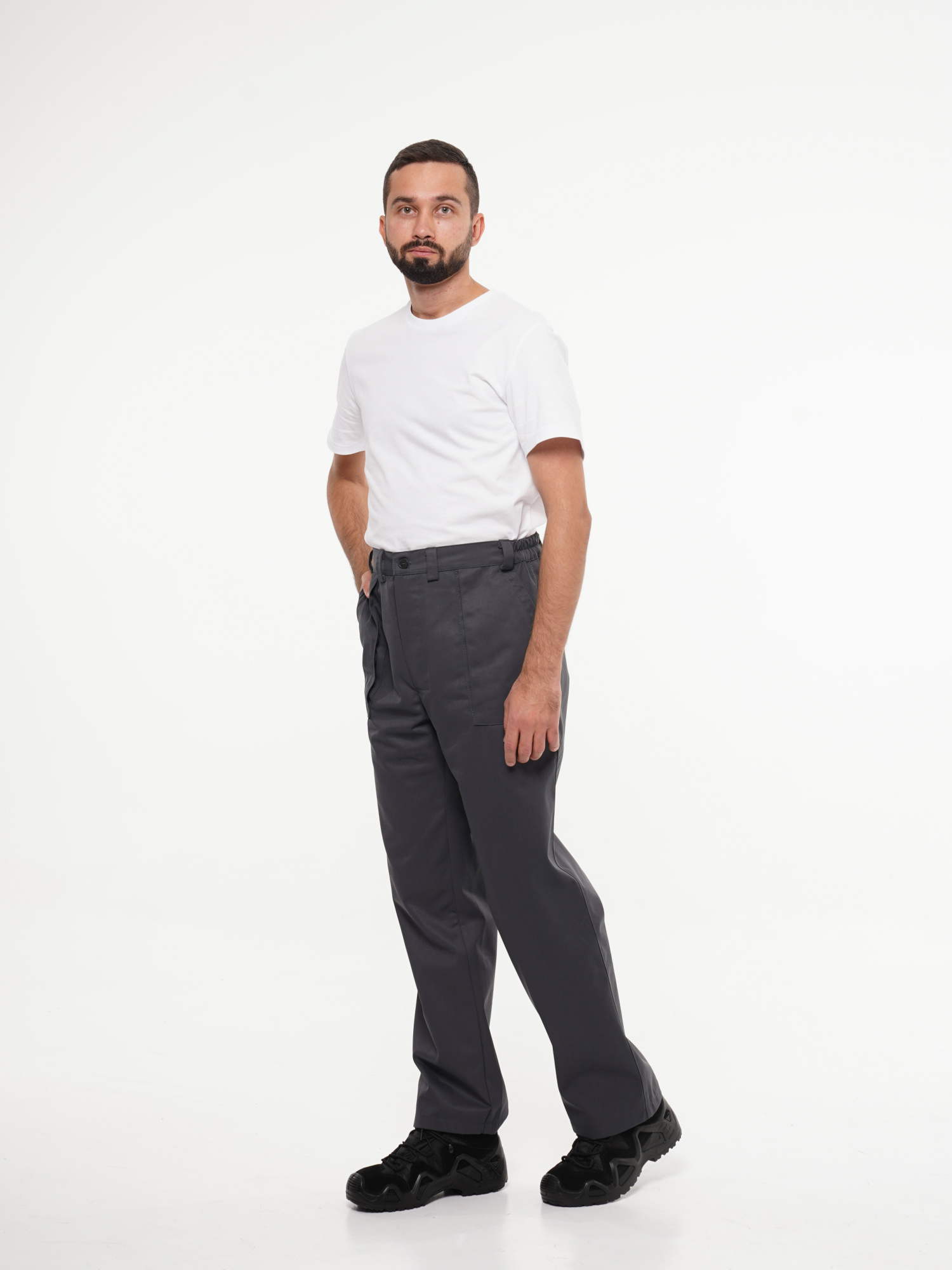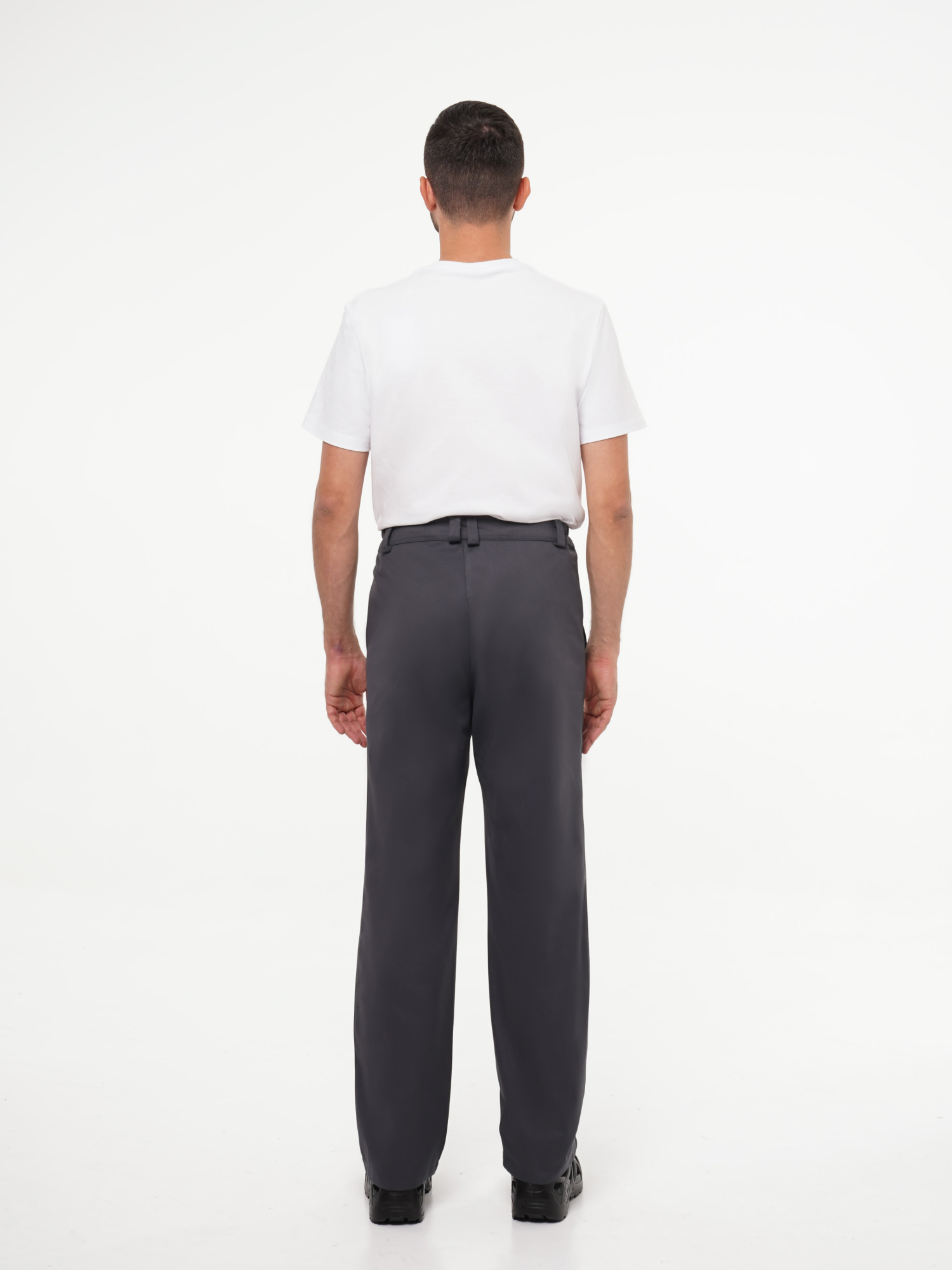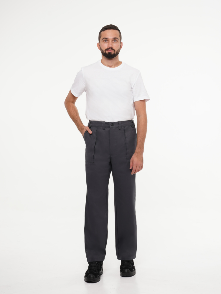 Брюки прямого покроя с притачным поясом, застёгивающимся на одну пуговицу. Пояс регулируется по ширине при помощи резинки по бокам. Изделие с застёжкой гульфика на пуговицы и двумя боковыми накладными карманами с наклонным входом.