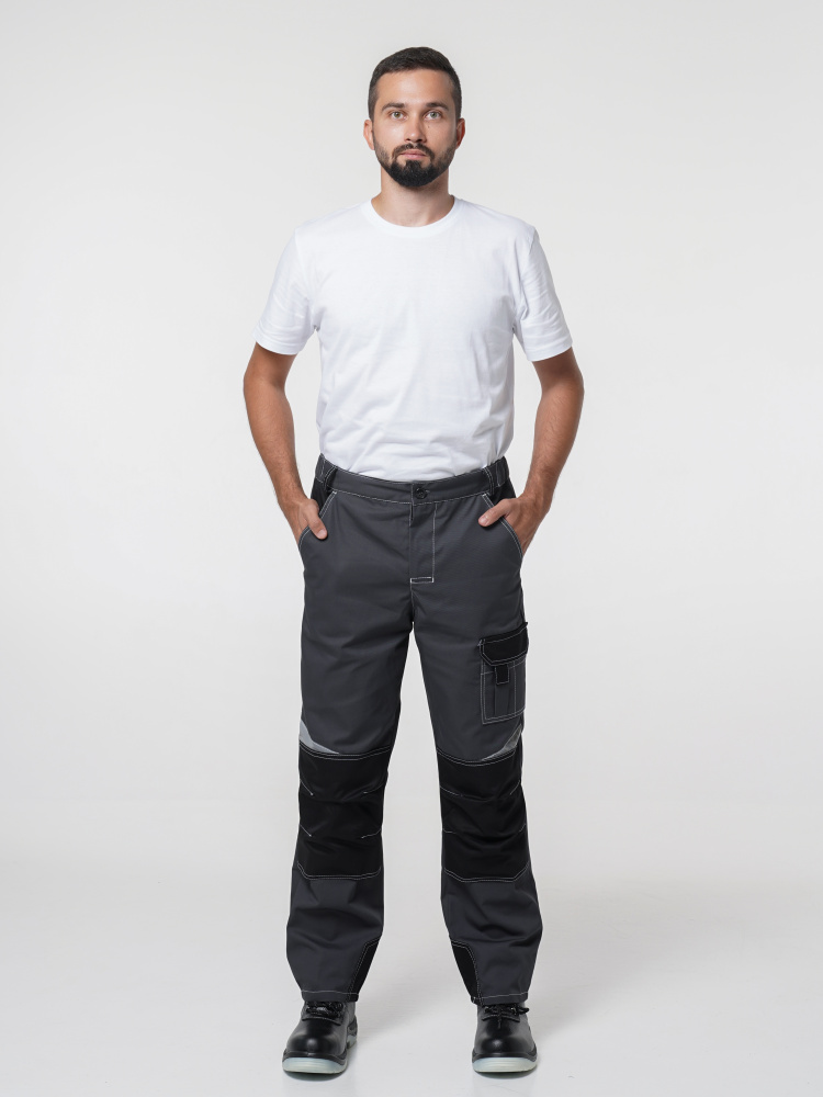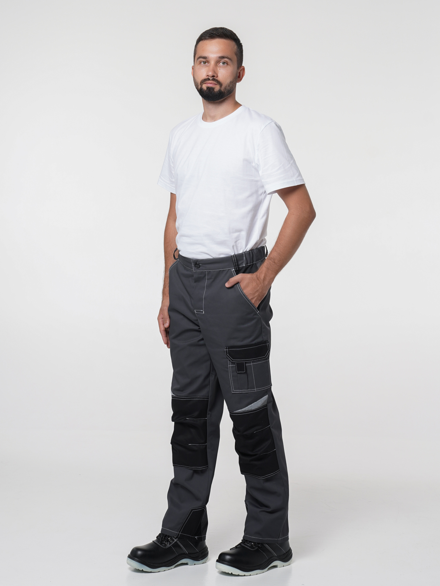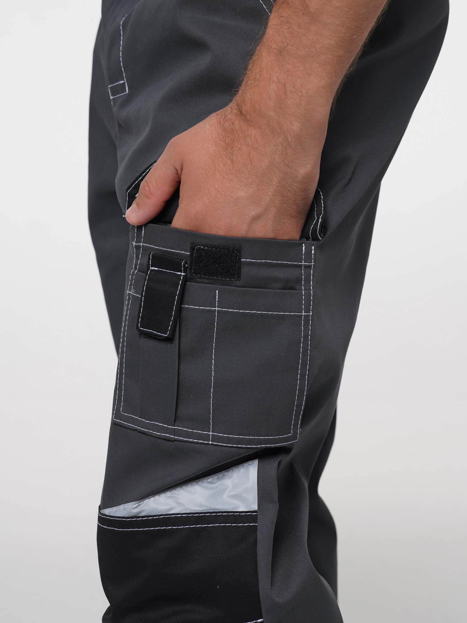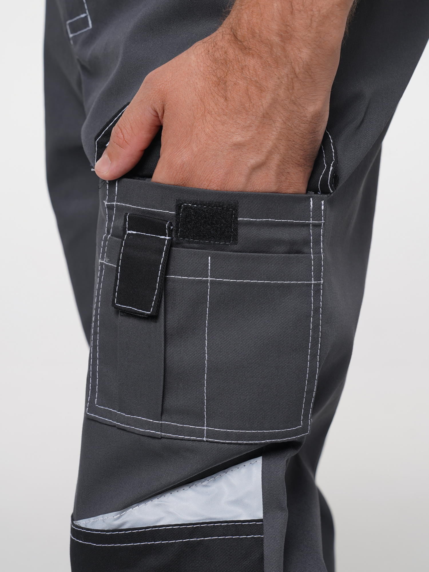 Брюки ФАВОРИТ-МЕГА прямые; с застёжкой гульфика на тесьму - «молния»; с застежкой пояса на одну петлю и пуговицу; с боковыми внутренними карманами; с карманами и фигурными клапанами застегивающиеся на потайную липучку на боковом шве; с фигурным карманом на задней половинке; с карманами под инструменты; с наколенниками. Пояс брюк частично стянут резинкой ткацкой по бокам. В брюках предусмотрена лента светоотражающая (мелкодисперсная белая) 50 мм фигурной формы.