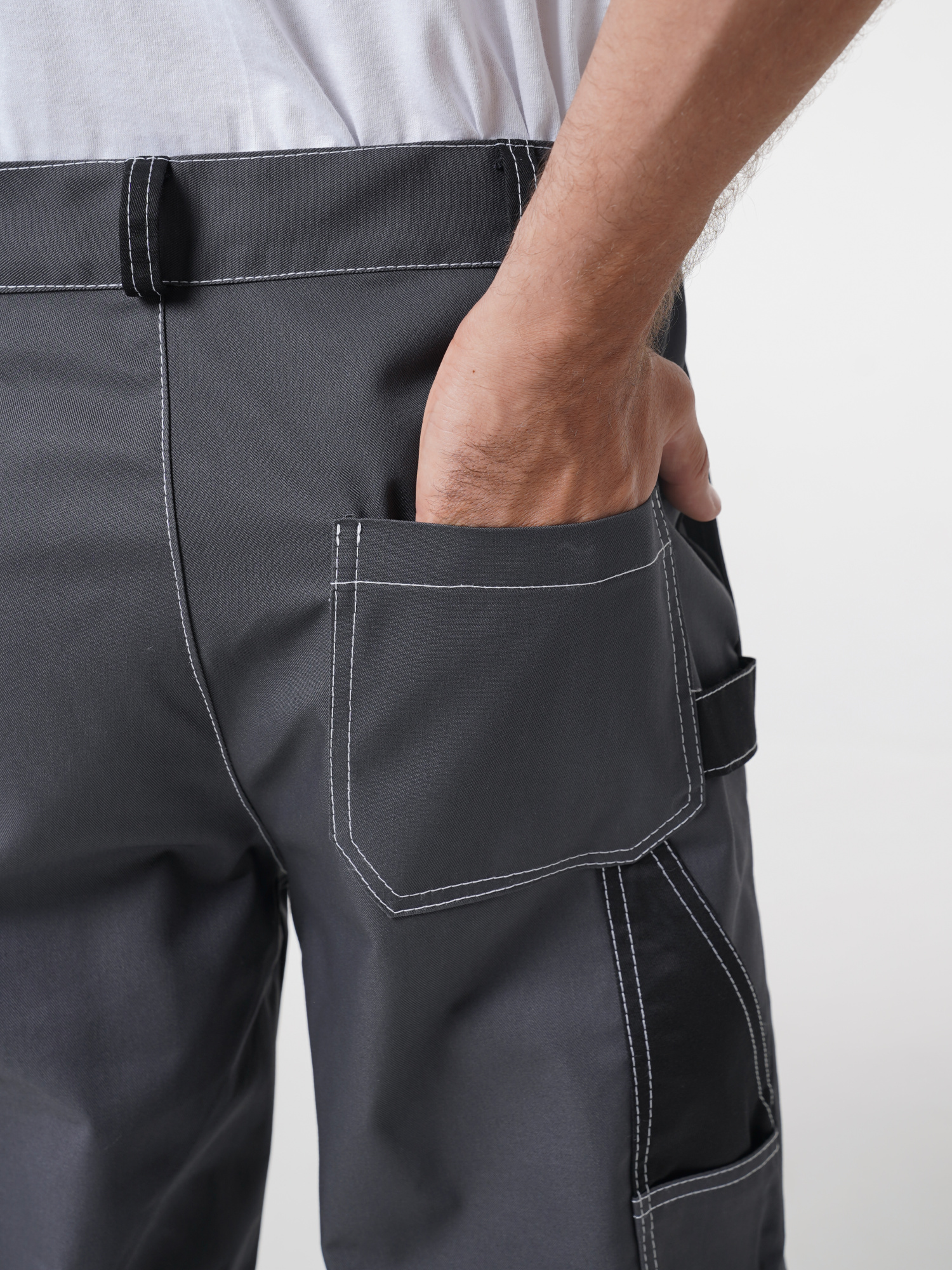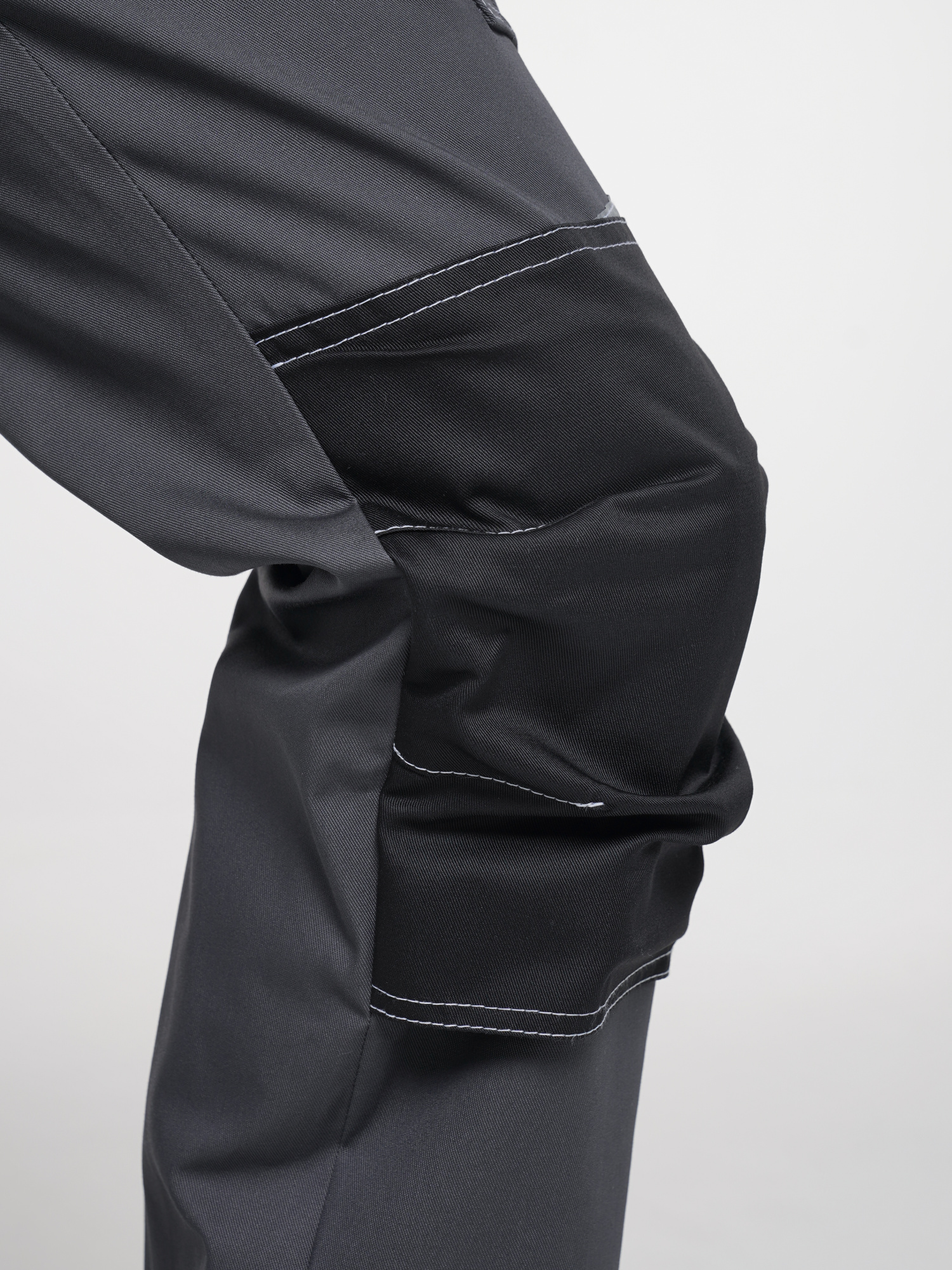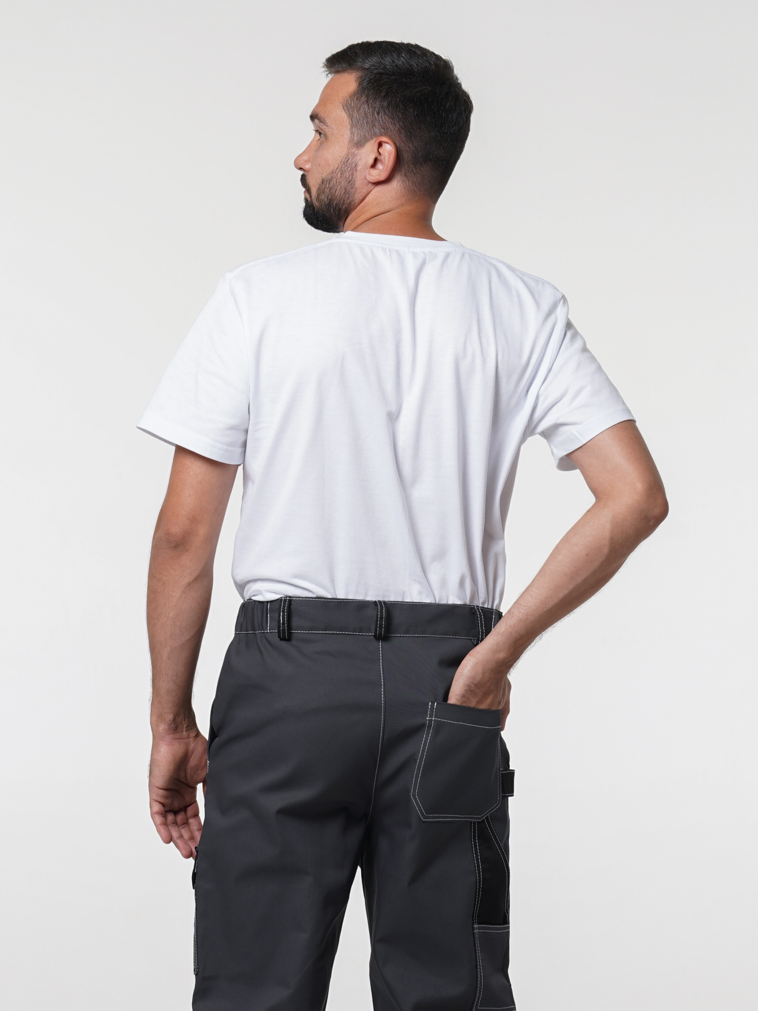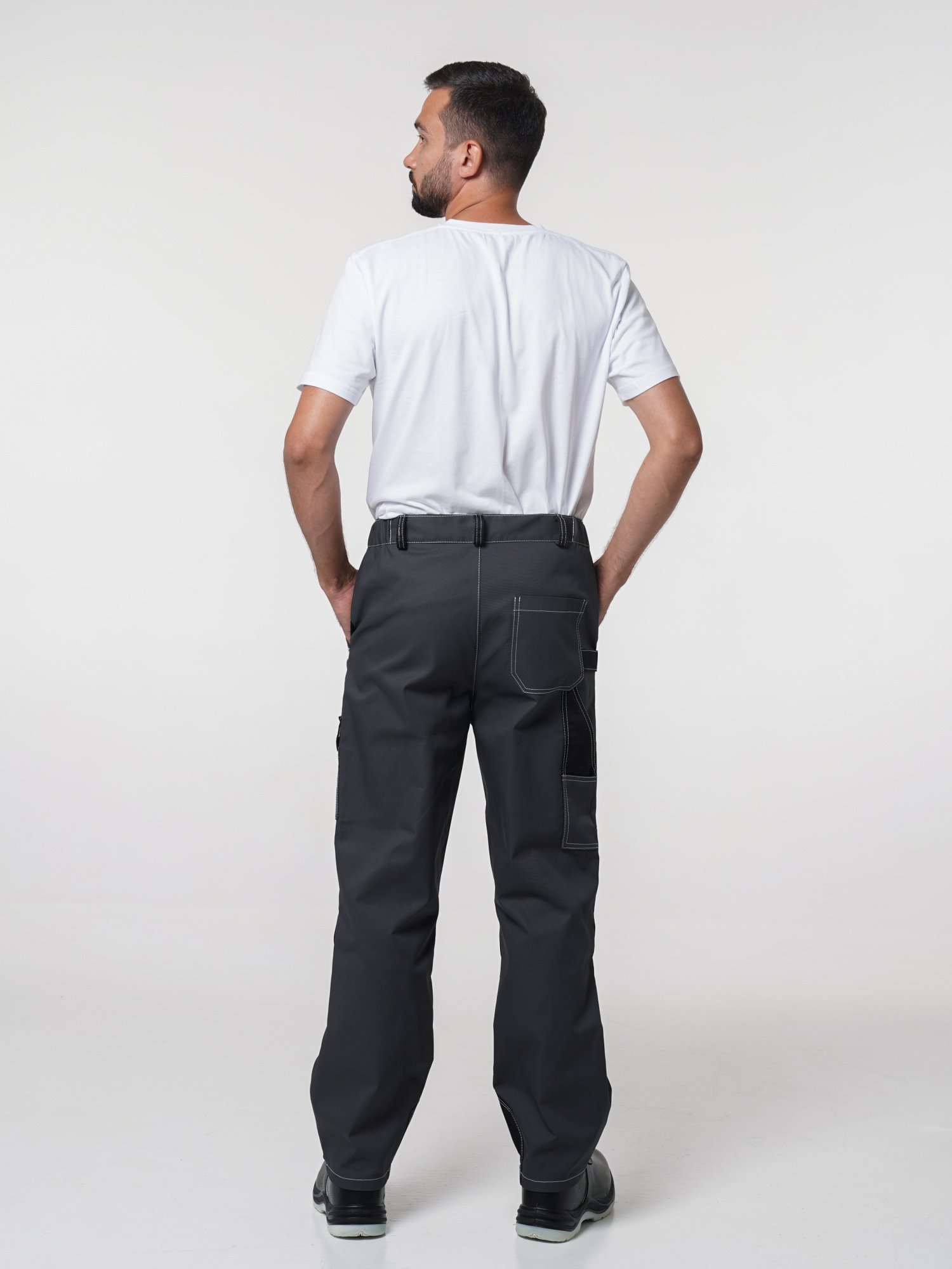Брюки ФАВОРИТ-МЕГА прямые; с застёжкой гульфика на тесьму - «молния»; с застежкой пояса на одну петлю и пуговицу; с боковыми внутренними карманами; с карманами и фигурными клапанами застегивающиеся на потайную липучку на боковом шве; с фигурным карманом на задней половинке; с карманами под инструменты; с наколенниками. Пояс брюк частично стянут резинкой ткацкой по бокам. В брюках предусмотрена лента светоотражающая (мелкодисперсная белая) 50 мм фигурной формы.