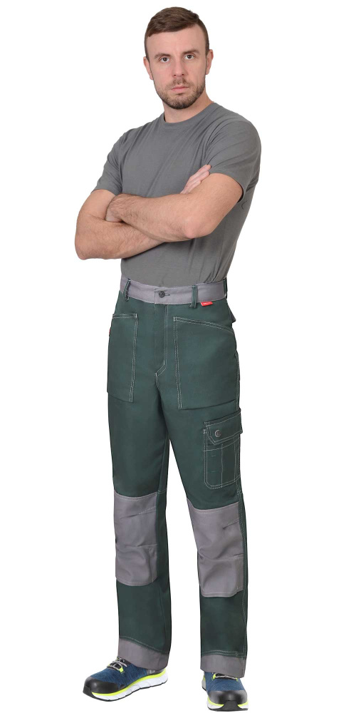 Брюки прямые, на поясе, с застёжкой спереди - гульфик с молнией, с накладными карманами спереди, сзади и на левом боковом шве, с объёмными наколенниками с нижним входом для амортизационного вкладыша. Объём брюк по талии регулируется при помощи хлястиков с кнопками на поясе.