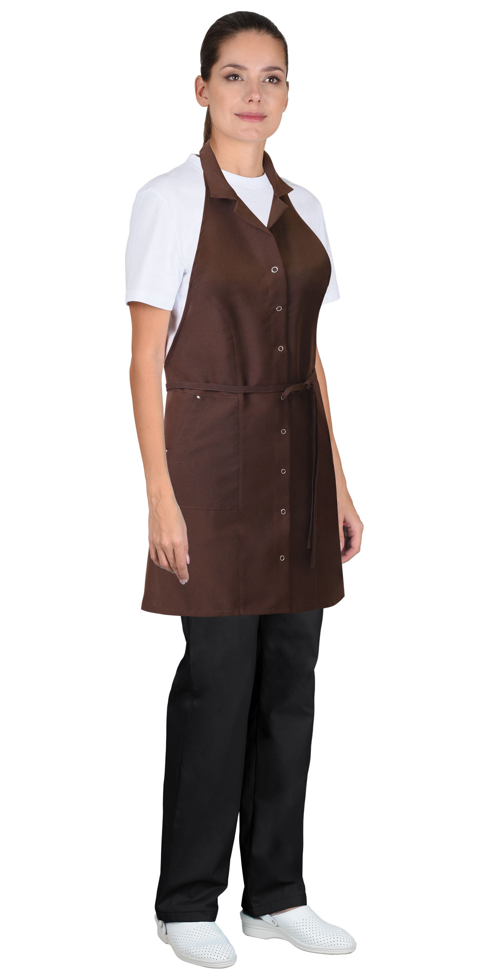 Фартук предназначен для защиты переда и боковых частей работающих от вредных производственных факторов в сфере обслуживания. Фартук с цельновыкроенным нагрудником с центральной бортовой сквозной застёжкой на 8 кнопок и прямой линией низа. Боковые завязки для регулировки фартука на фигуре по объему. Воротник втачной застёгивающийся сзади на 3 кнопки для регулировки фартука по шее. На нижние боковые части фартука настрочены накладные карманы.