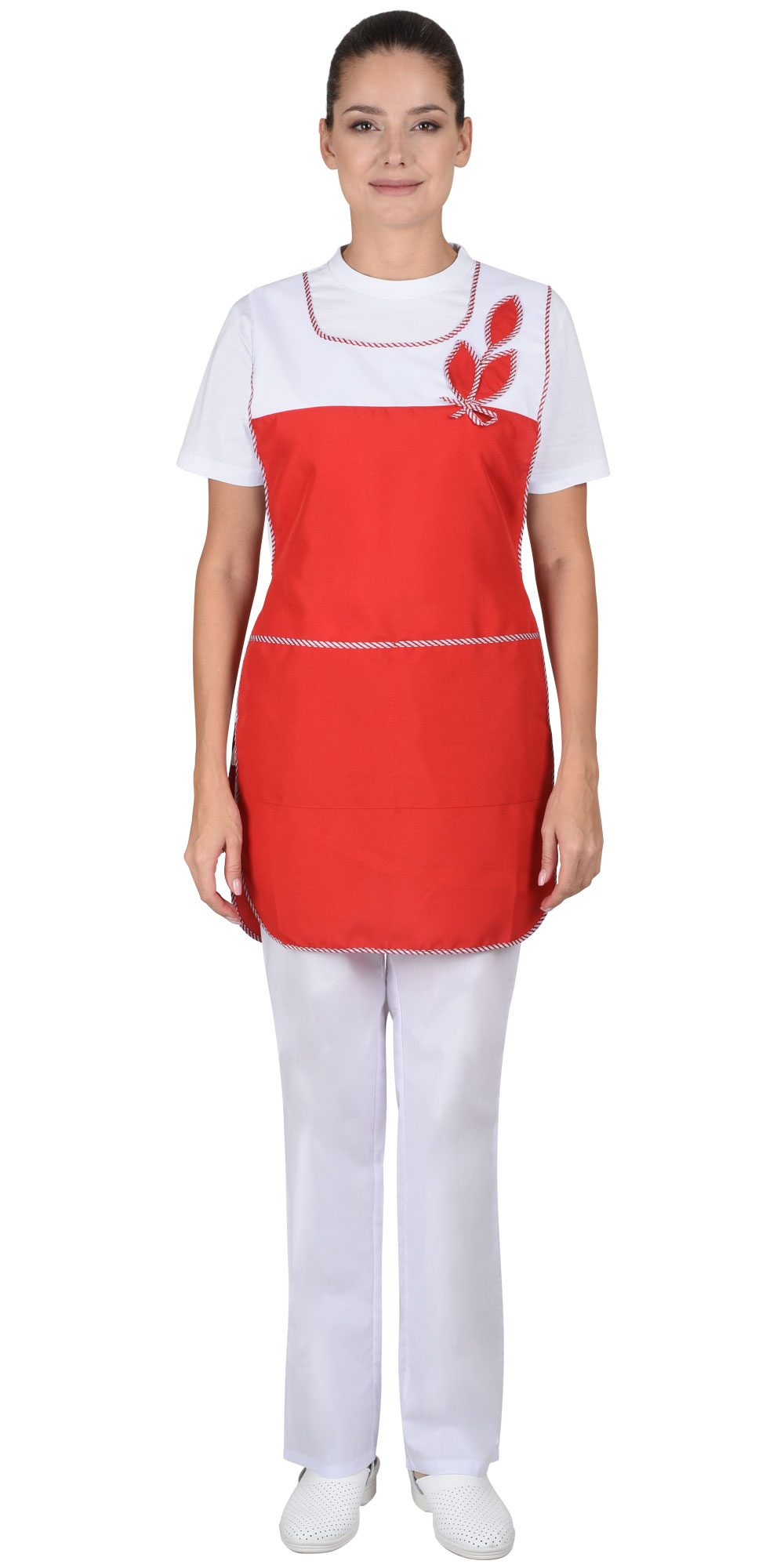 Фартук с круглым вырезом горловины, боковыми завязками для регулировки объема, с большим накладным карманом с зональным делением. Фартук по горловине, верхнему срезу кармана и края окантован окантовочной лентой из отделочной ткани. На фартуке в области кокетки выполнена аппликация.