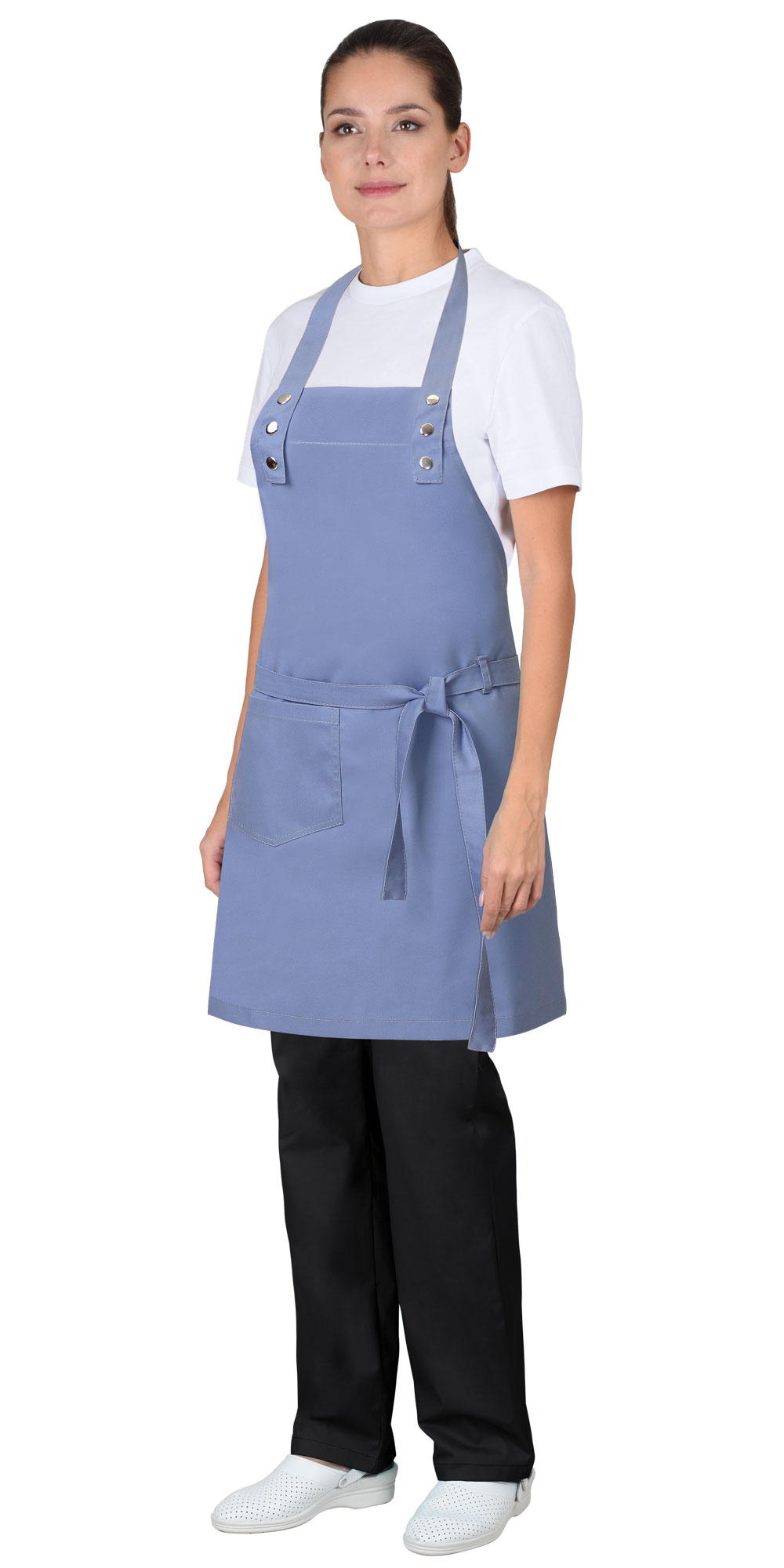 Фартук с нагрудником и с боковыми завязками для регулировки объема. Съёмная шейная бретель, пристёгивающаяся на кнопки. В нижней левой части накладной карман. На правой стороне фартука, на уровне притачивания боковых завязок, шлёвка.