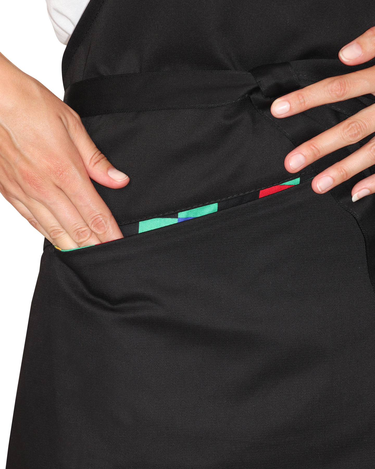 Фартук с нагрудником и с боковыми завязками для регулировки объема. Съёмная шейная бретель, пристёгивающаяся на кнопки. На шейной бретели с левой стороны вставлена отделочная деталь из отделочной ткани. В нижней части фартука расположен карман, выполненый из отделочной ткани. С левой стороны отрезная декоративная деталь из отделочной ткани.