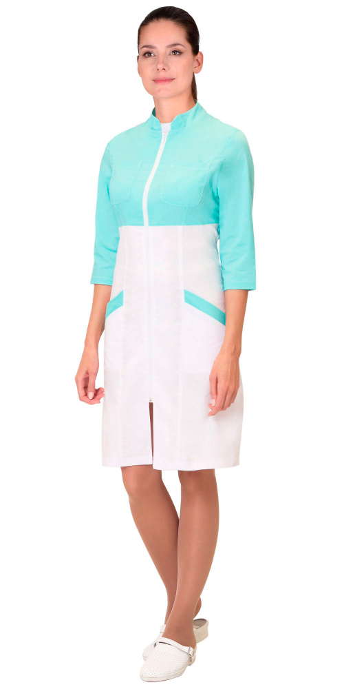 Халат прилегающего силуэта с центральной застёжкой на молнию. Воротник стойка. Два накладных нагрудных и два внутренних боковых кармана. Рукава втачные, длиной 3/4.