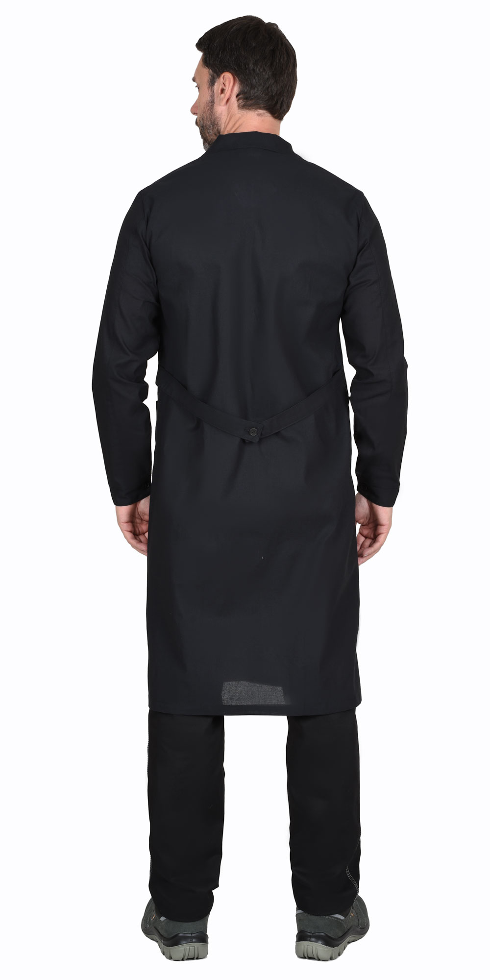 Тк. бязь, 100% х/б. Отложн. воротник, застёжка на пуговицы, два кармана. Манжеты рукавов на пуговице. По талии спинки - хлястик. ГОСТ 12.4132-83.