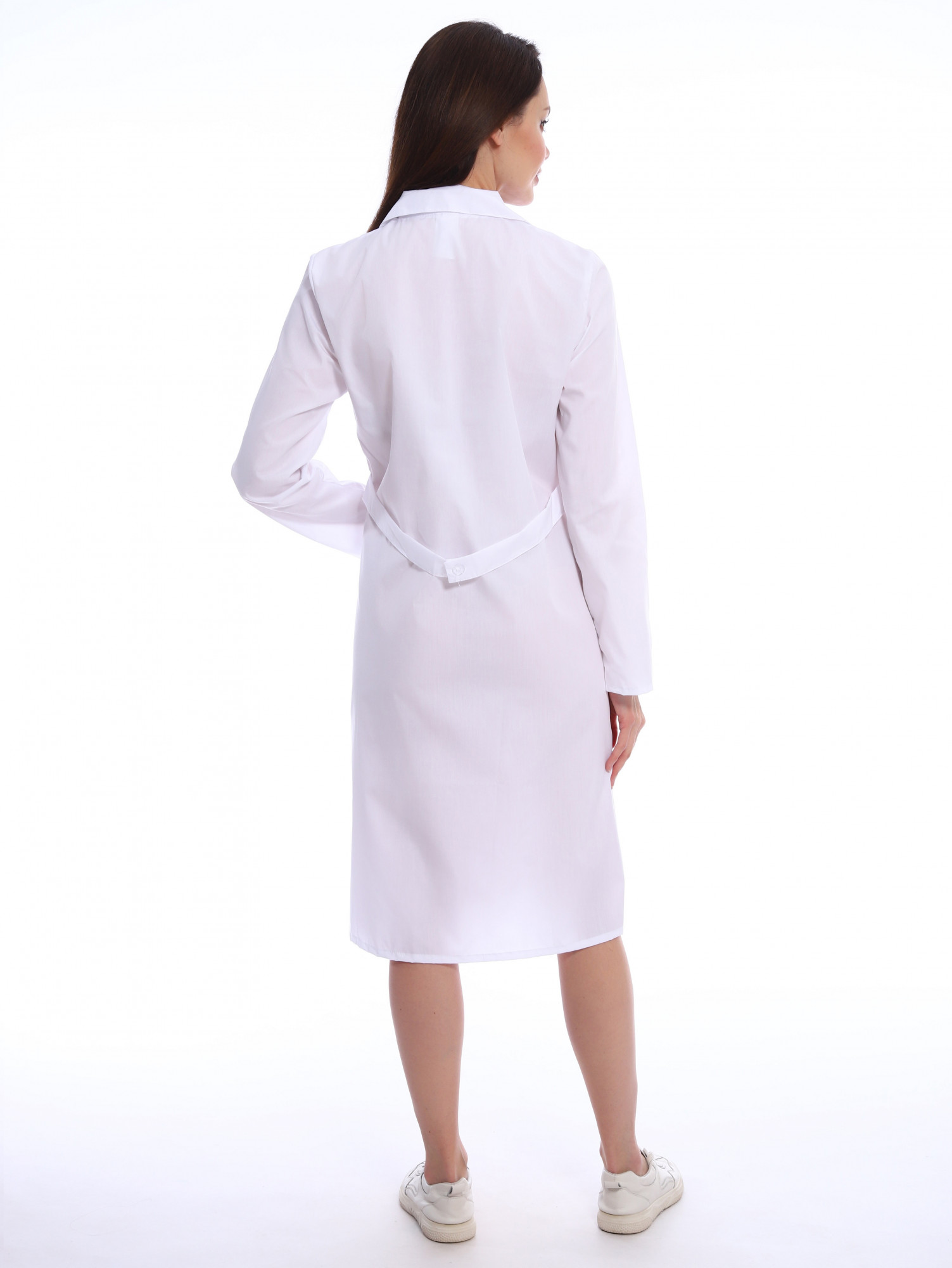 Халат женский с фигурной отделкой на лацканах и карманах, застежка на пуговицах, вертикальные рельефы. Ширина по линии талии регулируется хлястиком.