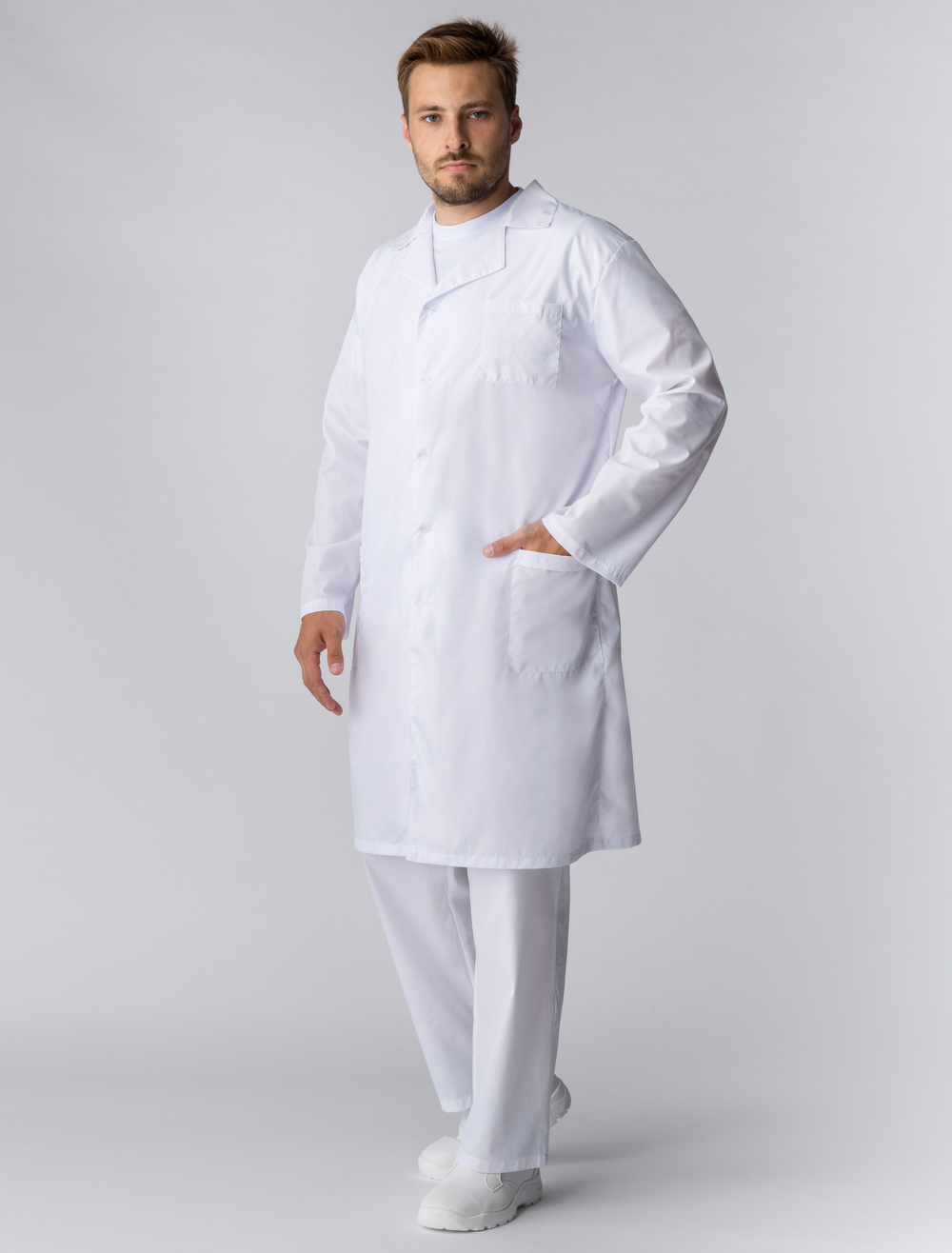 Халат рабочий мужской «Классика» предназначен для работы на производствах, в медицинских и образовательных учреждениях. Халат белый рабочий изготовлен в соответствии с ГОСТ из высококачественных материалов для комфортной деятельности в разных температурных режимах. Плотная ткань с водоотталкивающей пропиткой надежно защищает от загрязнений разного типа, отличается износостойкостью, длительным периодом эксплуатации, не просвечивает. Халат с длинным рукавом и длиной ниже колена застегивается на пуговицы, очень удобен в носке. Рабочая одежда регулируется по талии с помощью вшивного пояса на кнопке. В объемных боковых карманах удобно хранить записи и мелочи. Двойной нагрудный карман отличается повышенной прочностью и создан для размещения острых предметов.