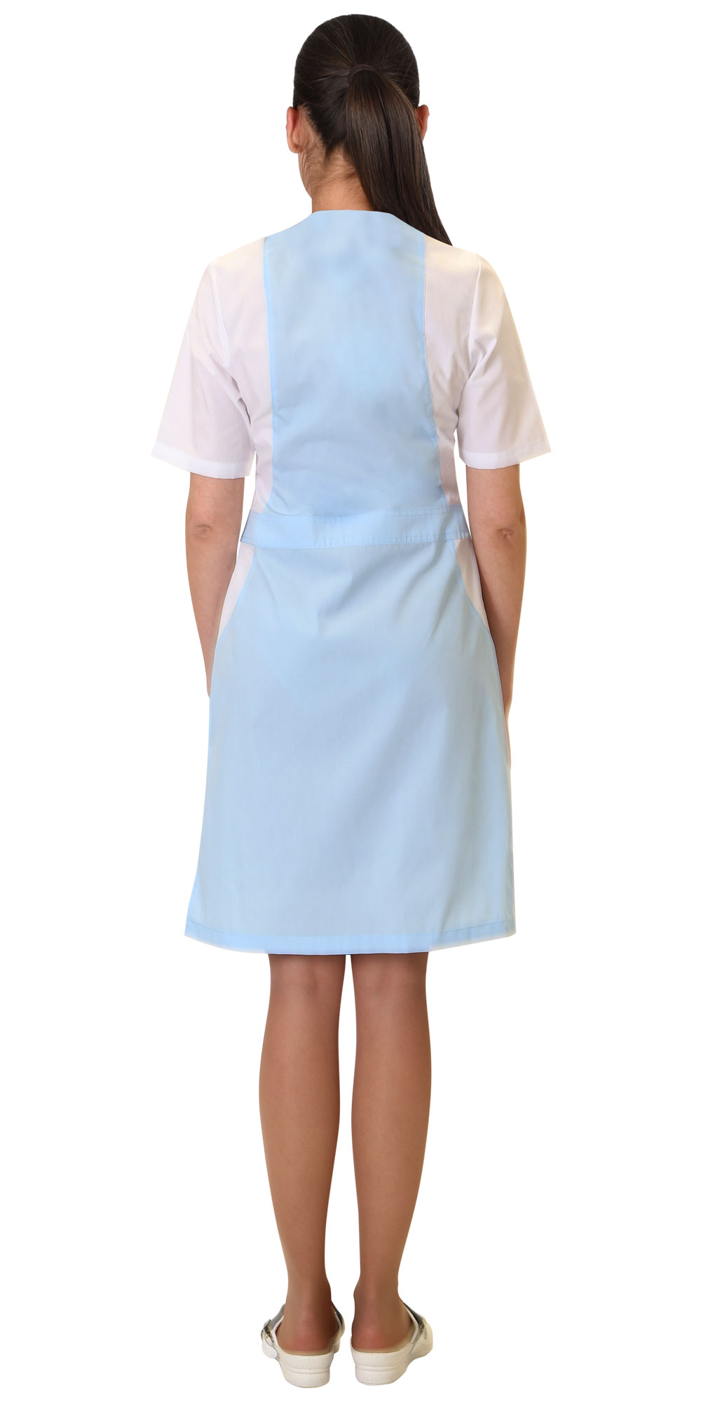 Халат женский полуприлегающего силуэта из ткани голубого цвета с белой отделкой. Центральная застежка на тесьму "молния", фигурный V-образный вырез, настроченный пояс, два нижних внутренних боковых кармана с овальным входом. Рукава втачные, короткие.