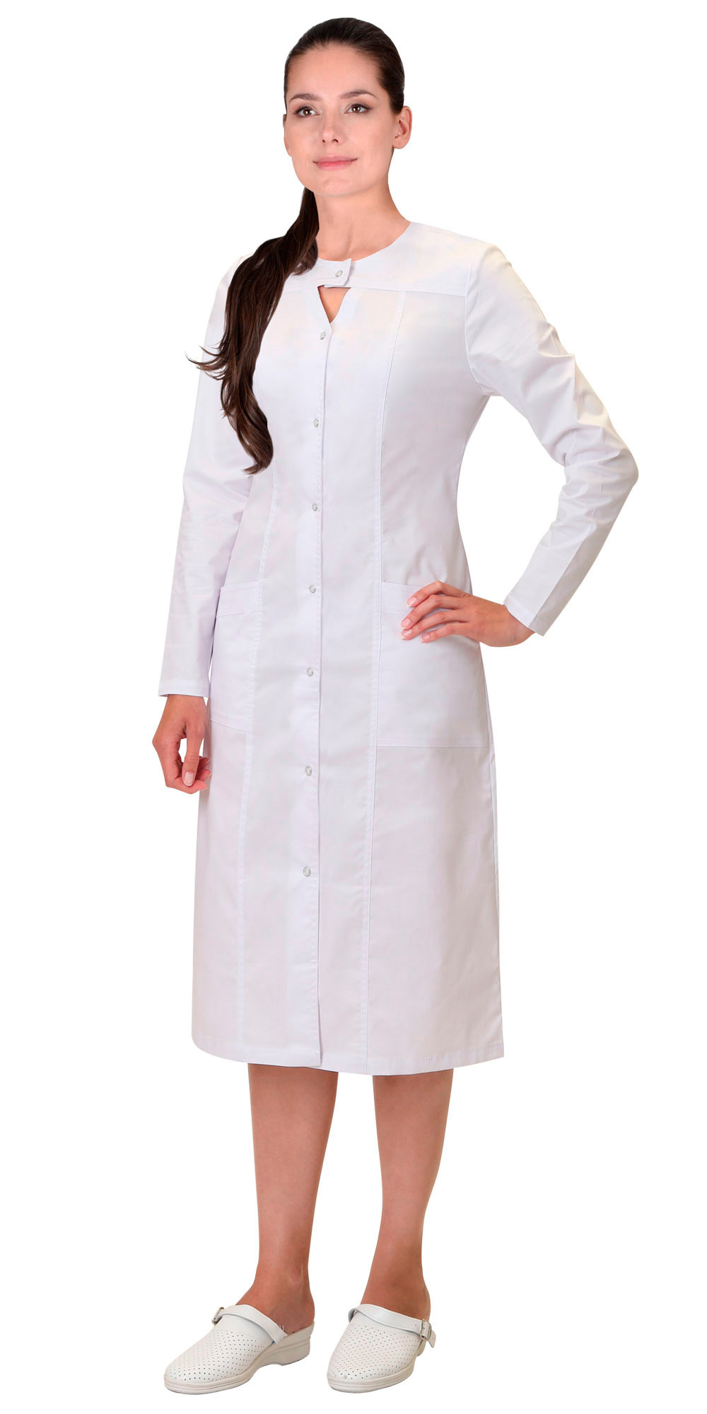 Халат женский полуприлегающего силуэта, с центральной сквозной застёжкой на кнопки. Без воротника, с овальным вырезом горловины и нижними накладными карманами. Рукава втачные длинные.