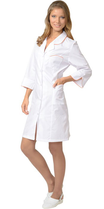 Халат с центральной застежкой на пуговицы. На полочках вертикальные рельефы. Фигурные карманы, воротник и манжеты с отделкой в виде канта контрастного цвета. Рукава 3/4. Цвет отделки: Оранжевый