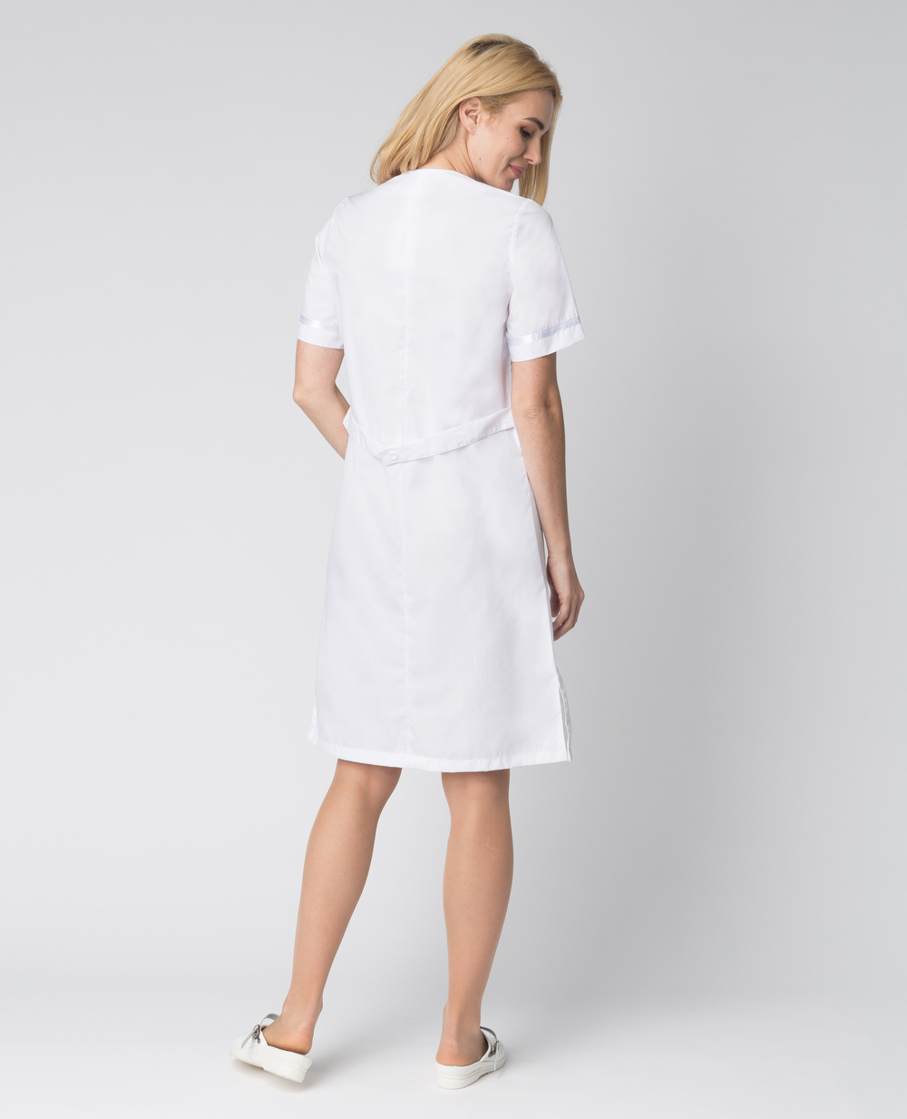 Халат женский «Светлана» изготовлен в соответствии с ГОСТ. Рабочая одежда удобного кроя из высококачественных материалов обеспечивает комфортную работу на производствах, в медицинских и образовательных учреждениях. Плотная ткань с водоотталкивающей пропиткой надежно защищает от загрязнений разного типа, отличается износостойкостью и длительным периодом эксплуатации. Халат белый рабочий дополняется вшивным поясом на кнопках, который подчеркивает и регулирует линию талии. Женский рабочий халат с коротким рукавом и длиной до колена отлично сидит по фигуре, не стесняет движения, выглядит модно и привлекательно. Халат застегивается на петли и пуговицы. В объемных боковых и нагрудном карманах удобно хранить записи и мелочи.