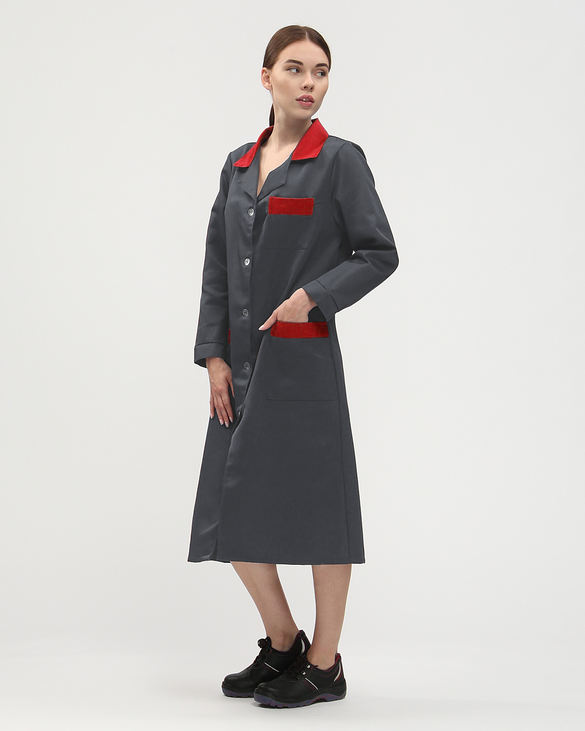Халат женский Технолог (тк.Смесовая,210), т.серый/красный Факел (128-132/170-176)