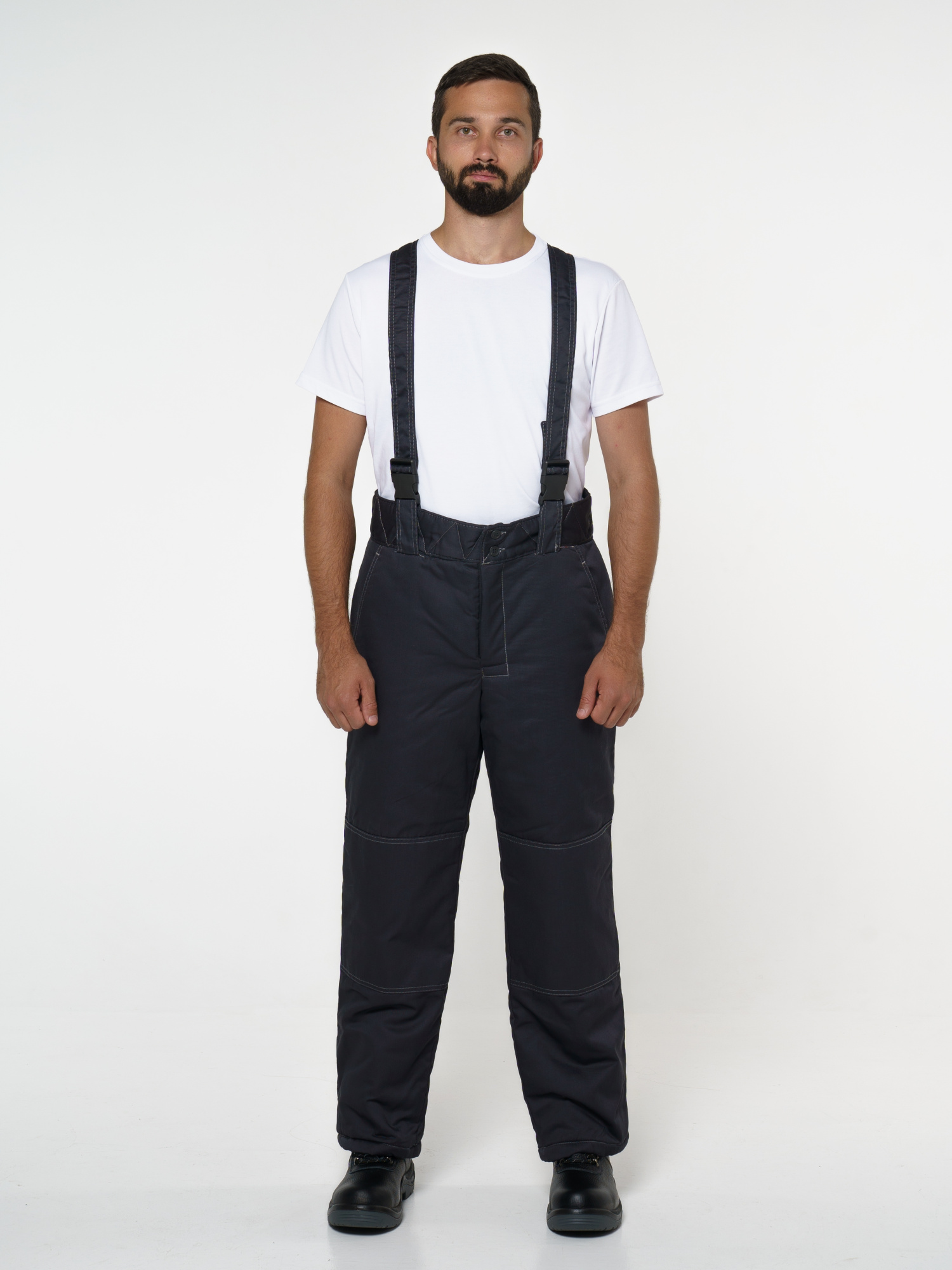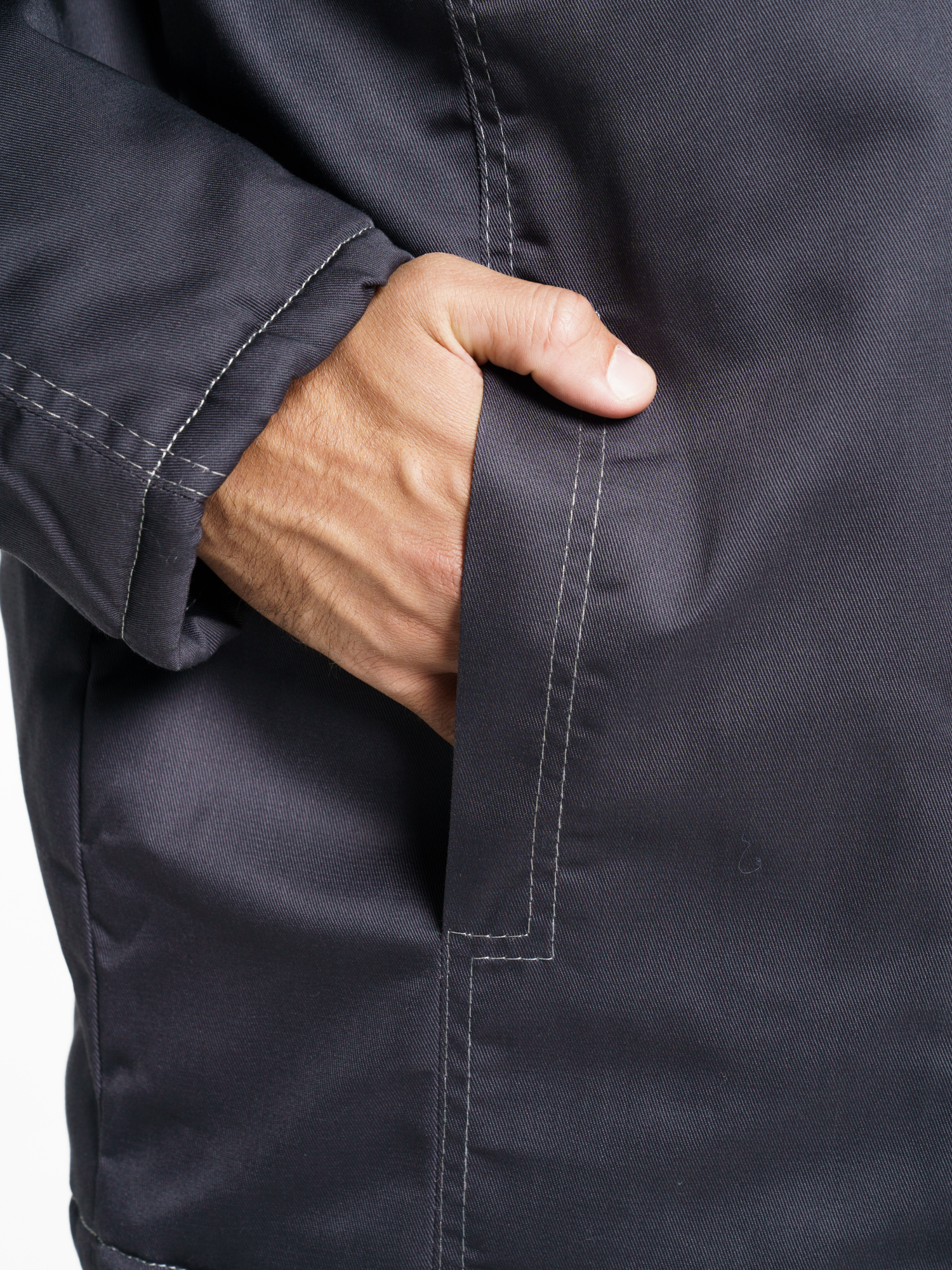 Куртка длинная, с центральной потайной застежкой на "молнию", вшивным ветразащитным клапаном на "липучках" и малыми декоротивными патами из отделочной ткани; внутренней планкой; воротник - "стойка" верхними накладными и нижними внутренними карманами, рукавами, рукава с налокотниками. Брюки с широким поясом, застегивающимся на пуговицы; с застежкой гульфика на "молнию", широкими шлевками держателями фастексов, в области колен наколенниками.