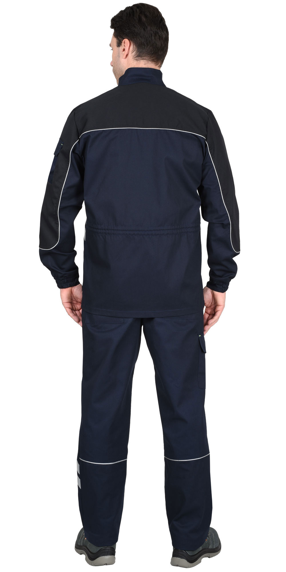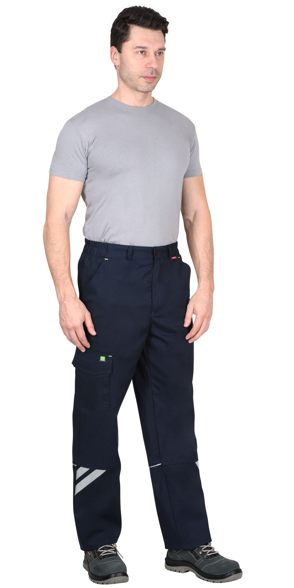 Брюки с притачным поясом с эластичной лентой по боковым швам, застегивающимся на пуговицу, со шлевками, с застежкой гульфика на молнию, с различными функциональными карманами, с элементами из СВ канта и СОП, обеспечивающие безопасность работы в условиях пониженной видимости.