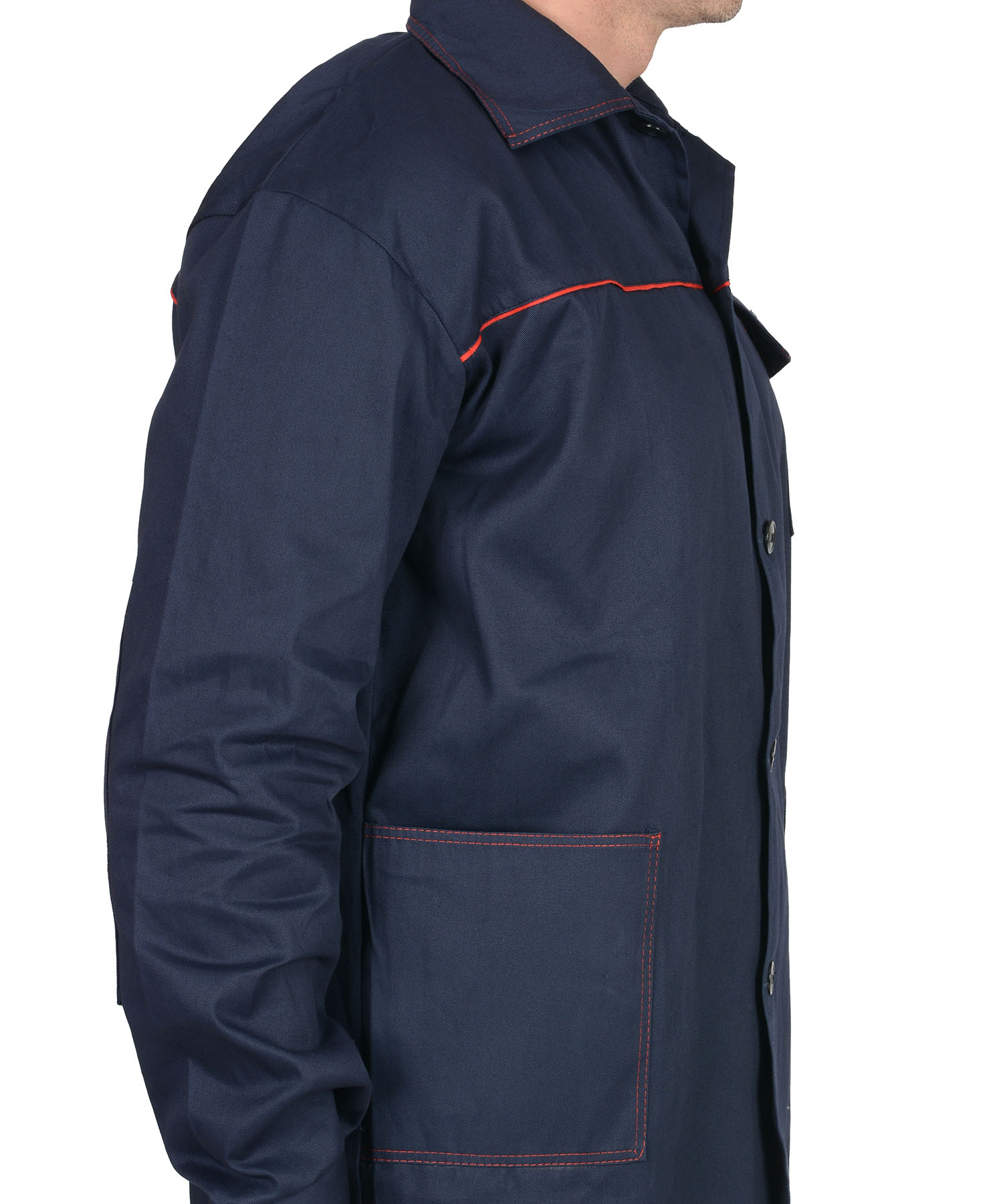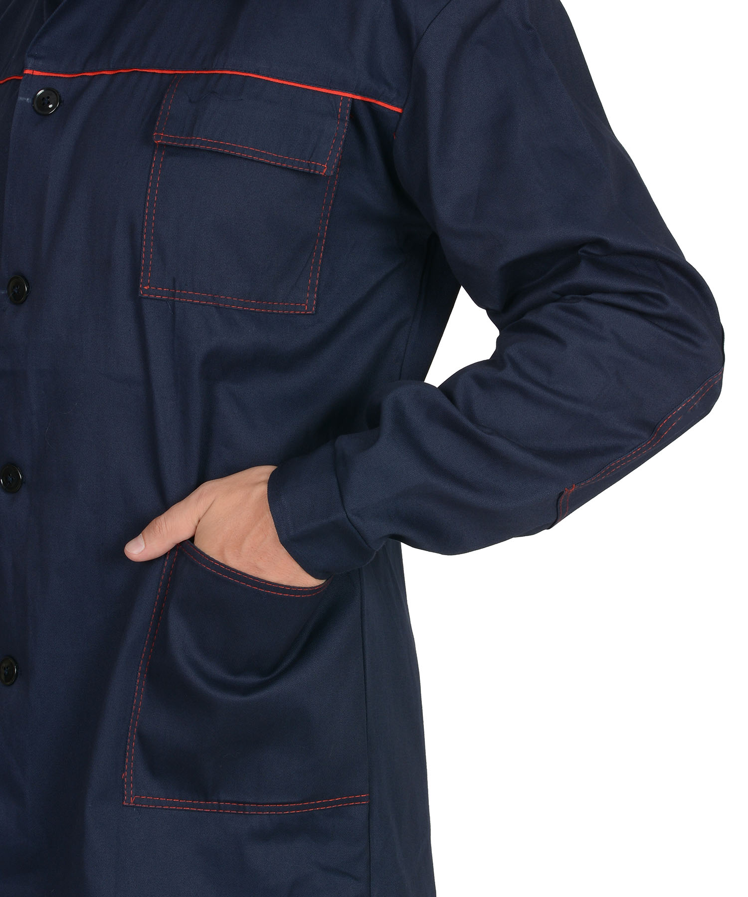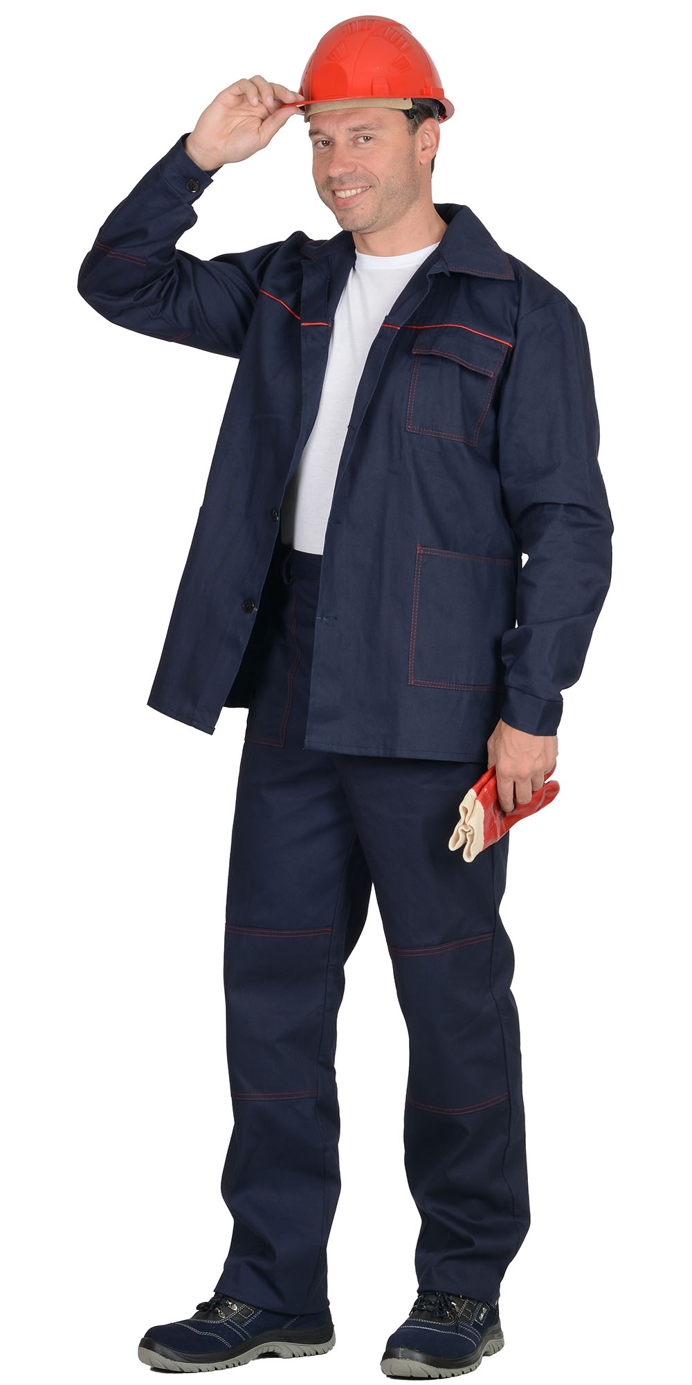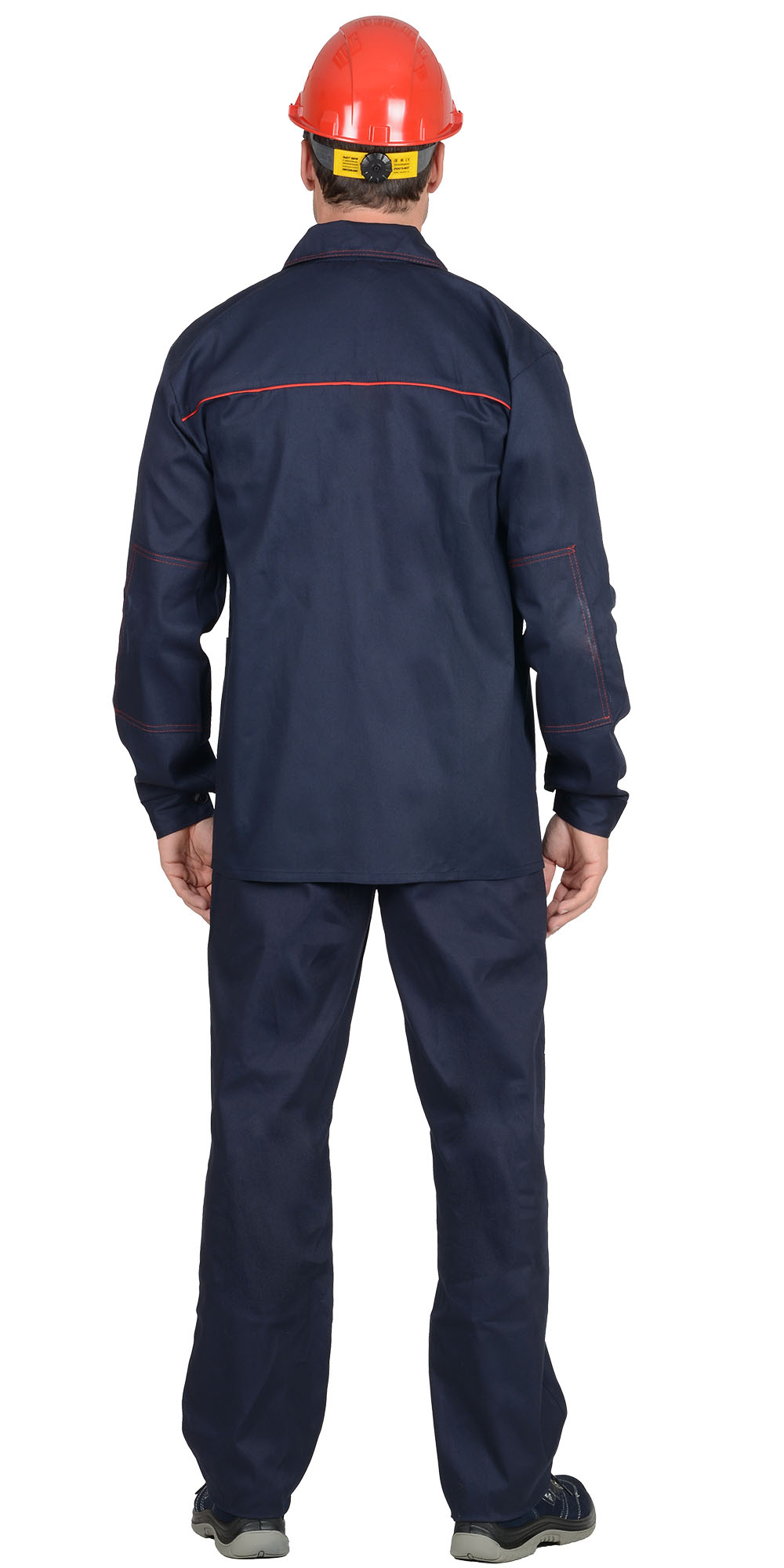 Куртка длинная, прямого силуэта, отложной воротник, с нагрудными и нижними накладными карманами. Манжеты рукавов на пуговице. Куртка и брюки с застёжкой на пуговицы. Брюки прямого покроя с накладными карманами и наколенниками. Кант, отделочные строчки красные. ГОСТ 12.4.280-2014.