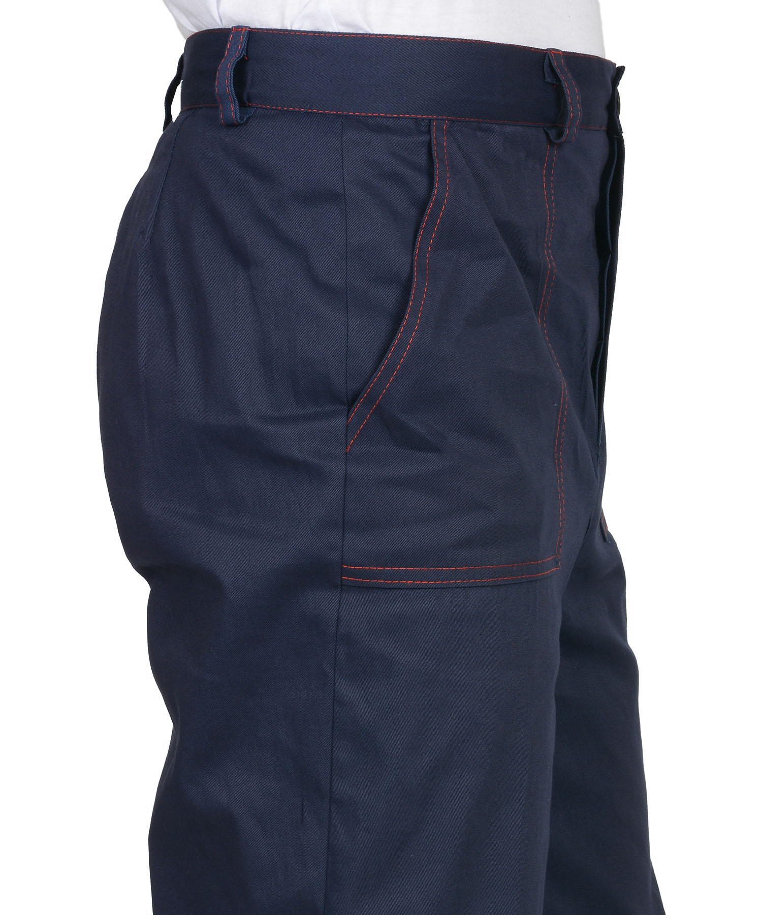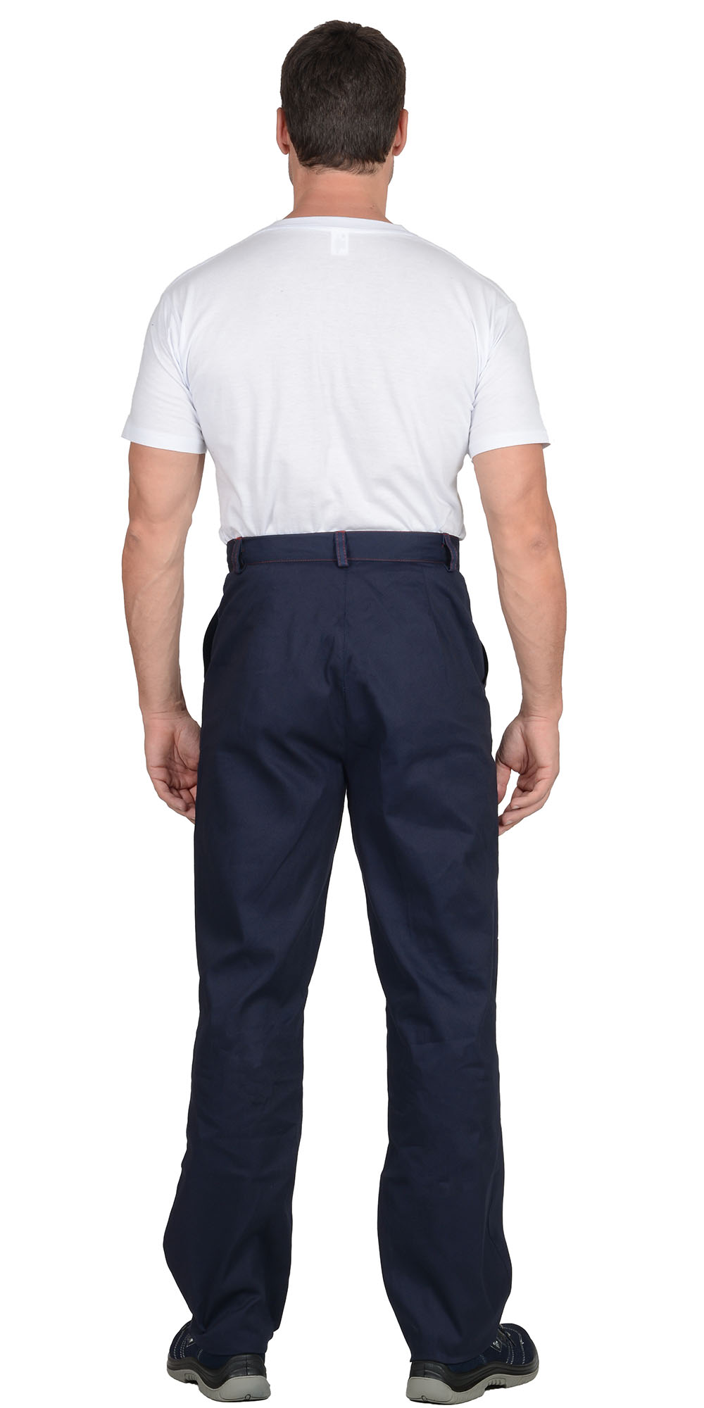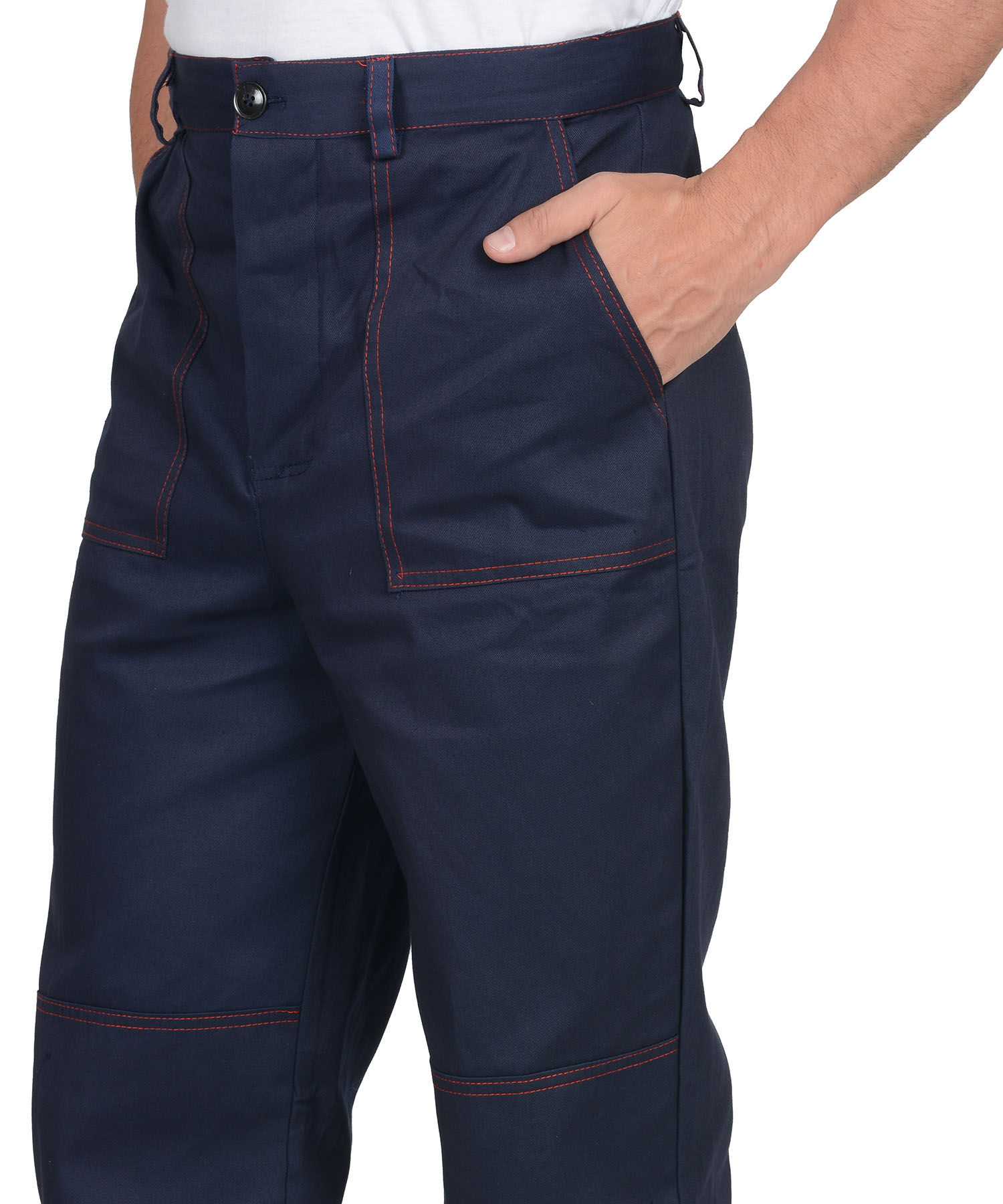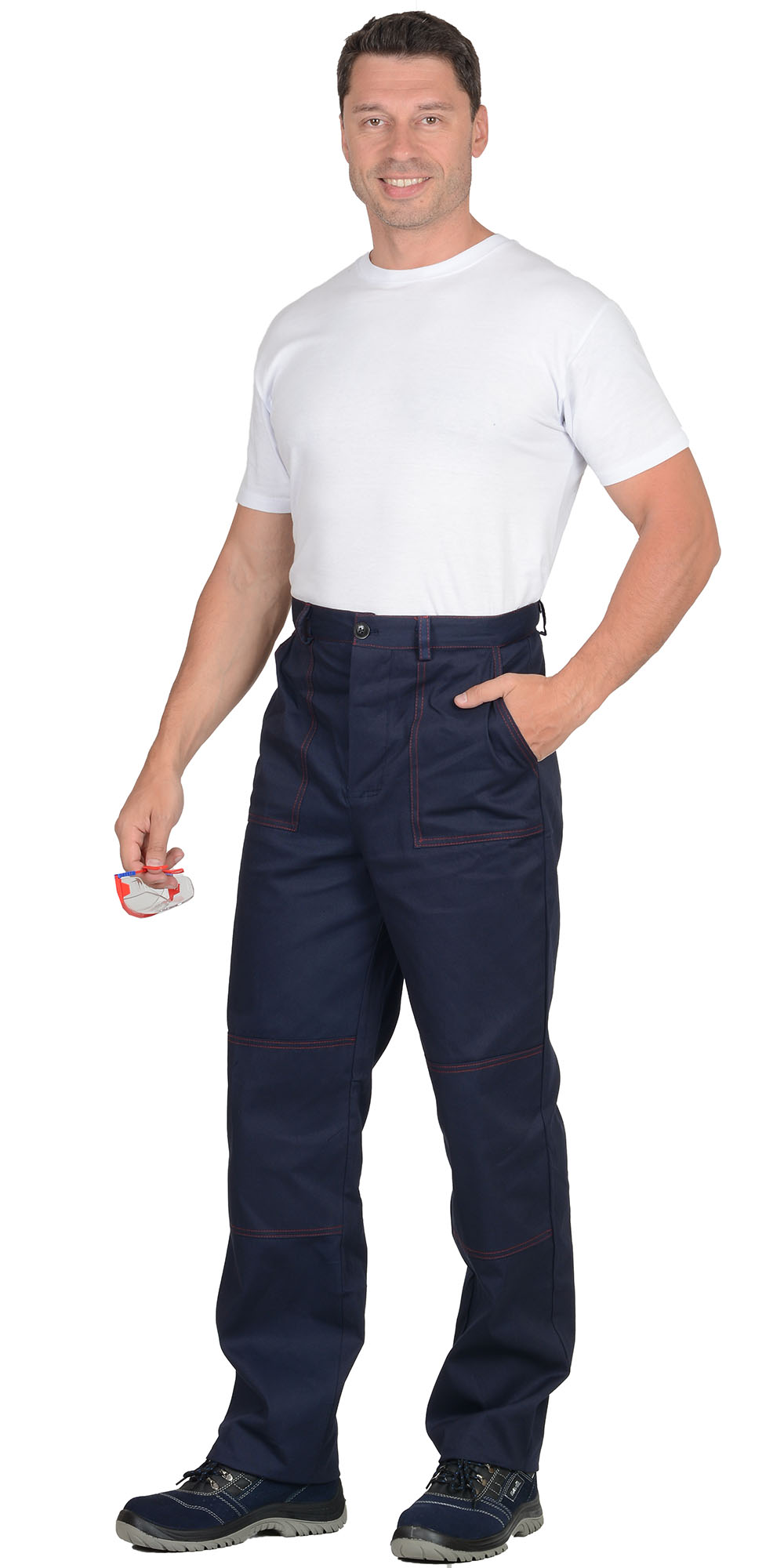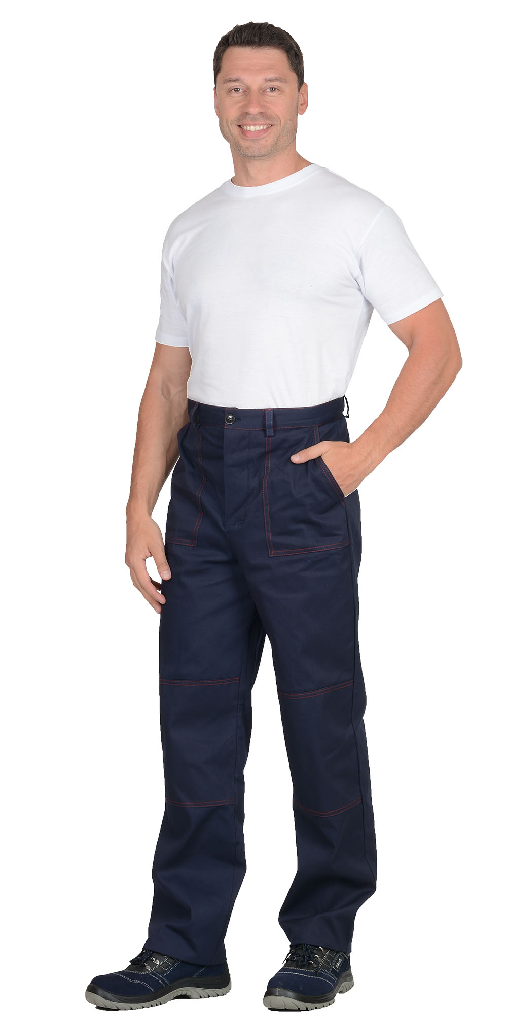 Куртка длинная, прямого силуэта, отложной воротник, с нагрудными и нижними накладными карманами. Манжеты рукавов на пуговице. Куртка и брюки с застёжкой на пуговицы. Брюки прямого покроя с накладными карманами и наколенниками. Кант, отделочные строчки красные. ГОСТ 12.4.280-2014.