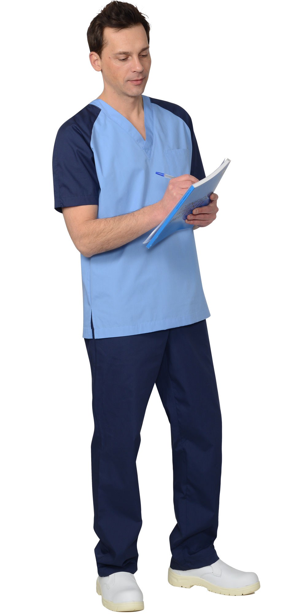 Костюм состоит из куртки и брюк. Куртка прямого покроя; с боковыми разрезами, с V-образным вырезом горловины и верхним левым нагрудным накладным карманом с делением для ручки. Рукава реглан, короткие. Брюки прямого покроя с внутренними боковыми карманами, пояс притачной, частично стянут на эластичную тесьму. Костюм можно дополнительно укомплектовать колпаком.