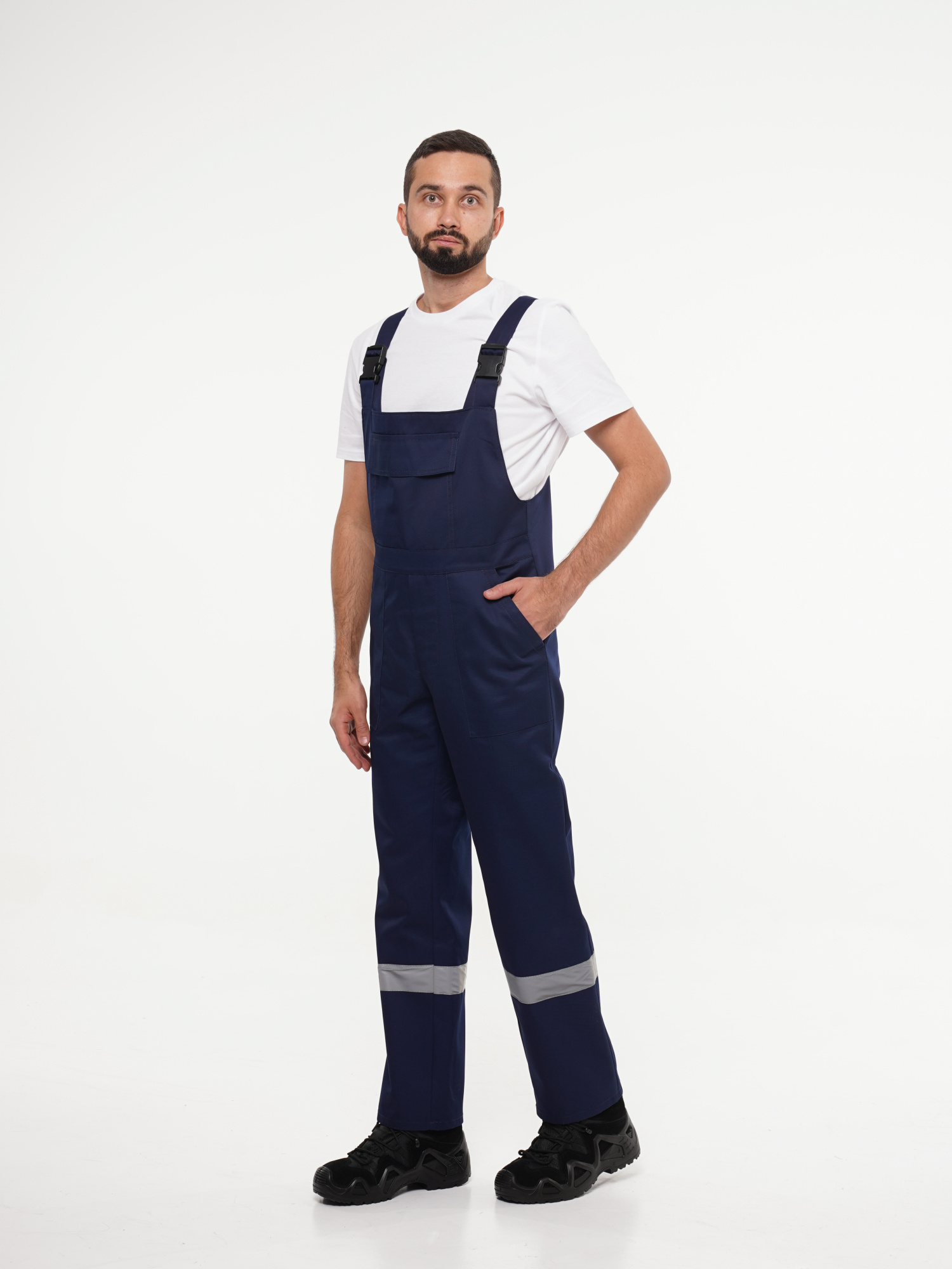Полукомбинезон прямого покроя, с застёжкой гульфика и застёжкой в правом боковом шве на пуговицы, с карманом и клапаном на нагруднике, с боковыми накладными карманами и карманами для инструментов.