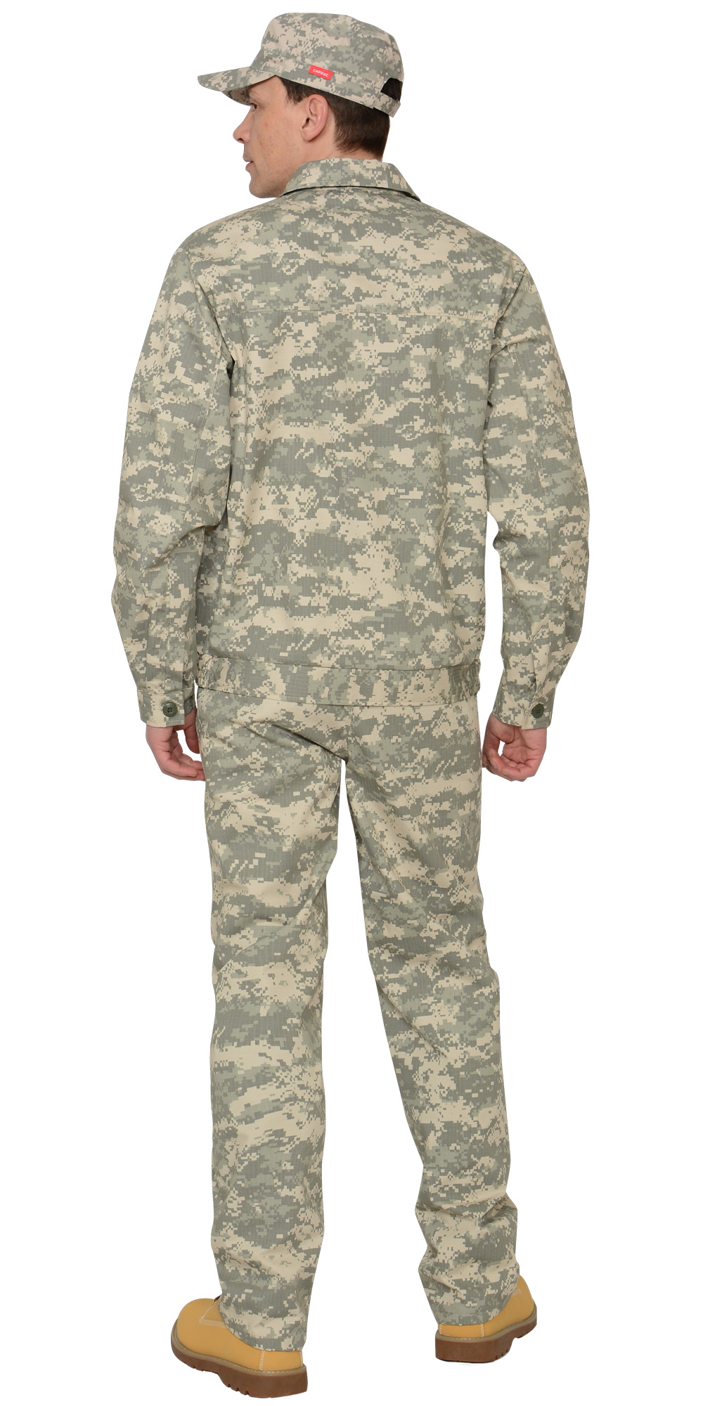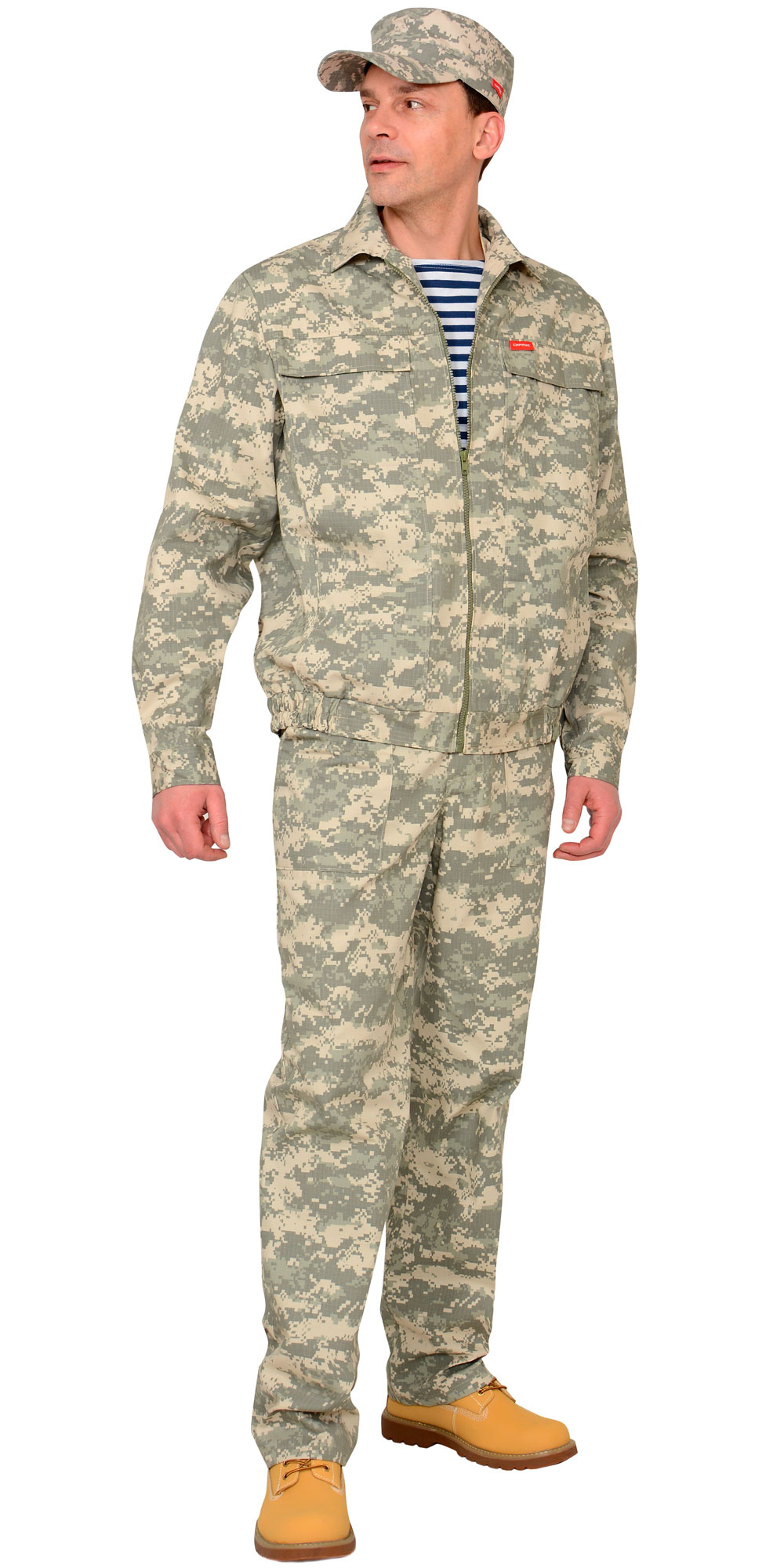 Тк."Рип-Стоп", ВО, 65% п/э., 35% х/б, 215 г/кв.м. Куртка короткая, с отложным воротником, с центральной бортовой застежкой на тракторную молнию ; с притачным поясом частично стянутым резинкой; с нагрудными карманами и клапанами на липучках, с боковыми карманами в вертикальных швах. Рукава, с манжетами на пуговицах.Брюки с притачным поясом, заст.гивающимся на пуговицу; с 5 шлевками и эластичной тесьмой по боковым швам брюк; с застежкой гульфика на три петли и пуговицы; с двумя накладными боковыми карманами с наклонным входом. ГОСТ 12.4.280-2014