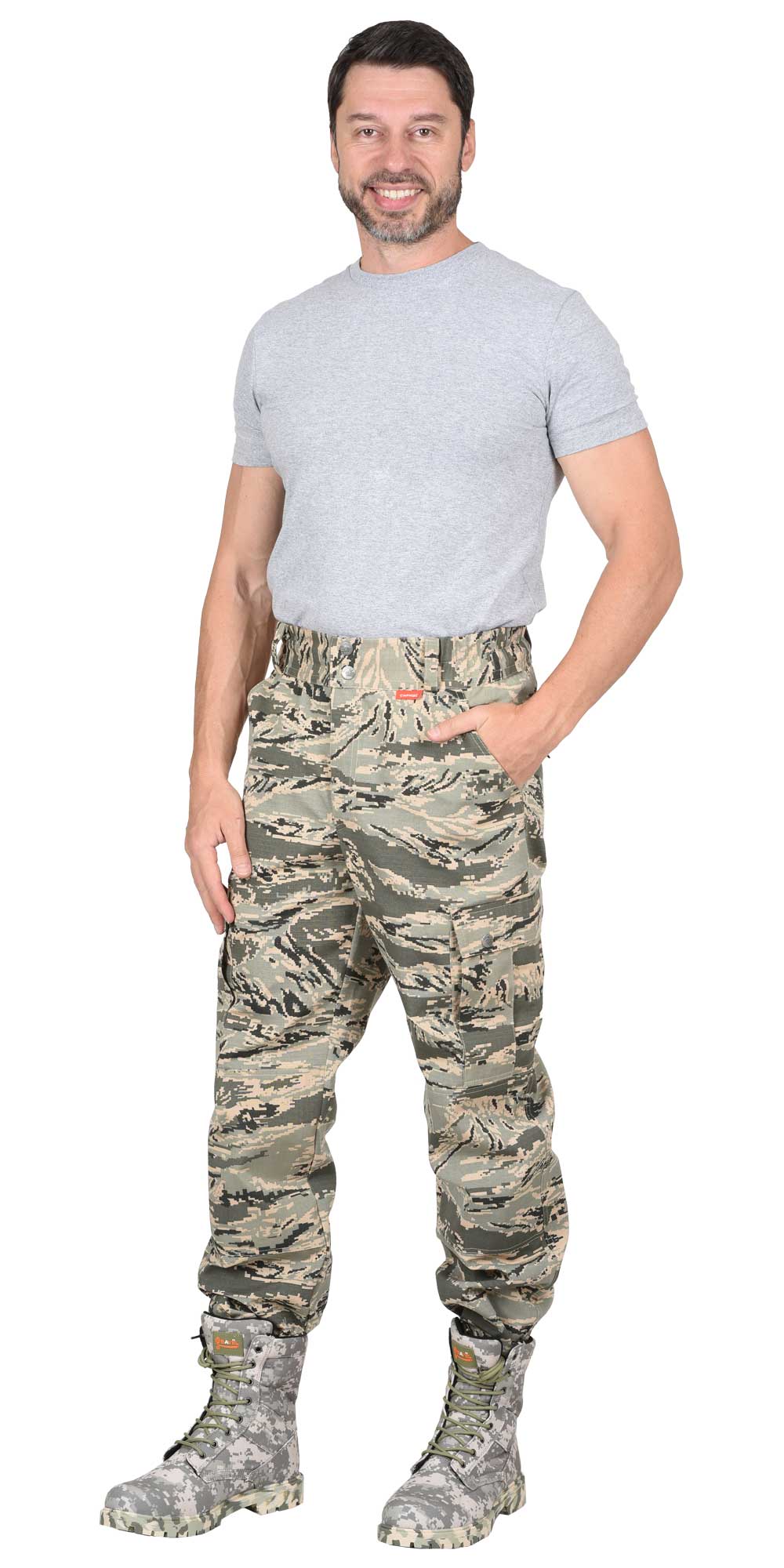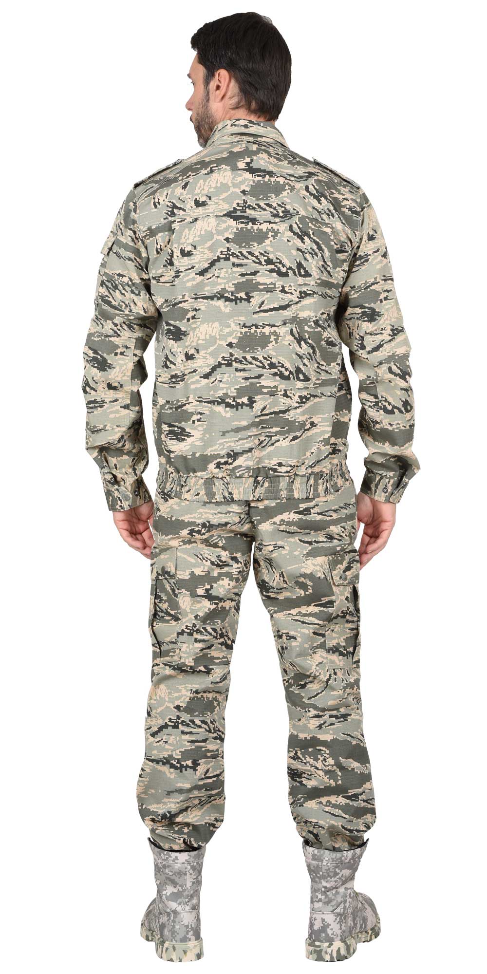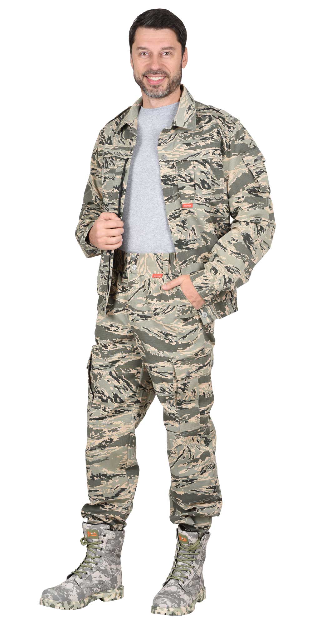 Костюм состоит из куртки и брюк. Куртка прямая с центральной застежкой на молнию, закрытой клапаном на кнопках; по низу пояс, собранный на резинку по бокам и спинке; кокетки на полочке и спинке, отложной воротник, на плечах погоны. Верхние карманы застегиваются на молнию, удобные нижние карманы; манжеты по низу рукавов регулируются с помощью кнопок. Брюки прямые, с центральной застёжкой на тесьму – «молния», с притачным поясом стянутым эластичной тесьмой по бокам, застегивающимся на две кнопки, с пятью широкими шлевками, с различными многофункциональными карманами, с наколенниками. Ткань верха: «Рип-стоп» смесовая с ВО пропиткой состав: 65 % п/э, 35% х/б, пл. 215 г/м2. ГОСТ 12.4.280-2014