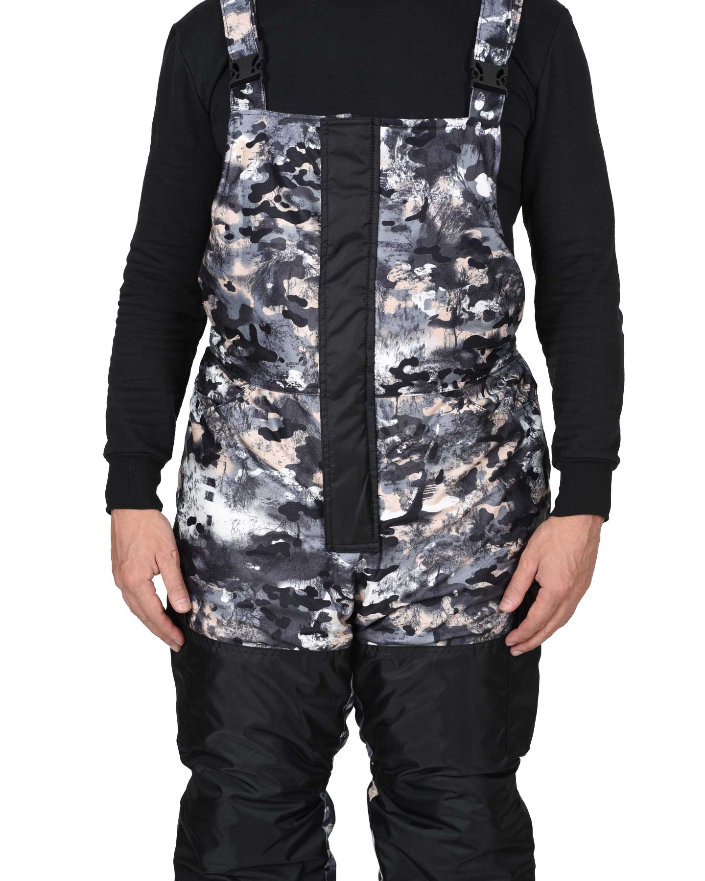 Полукомбинезон - прямой, утепленный, с центральной застёжкой на двухзамковую тесьму - «молния», с ветрозащитным клапаном, с притачными грудкой и спинкой, с внутренними боковыми карманами с фигурным входом, с боковыми накладными карманами на боковых швах брюк с фигурным клапаном, застегивающимся на потайную кнопку, с настрочным поясом, по спинке в поясе на всю ширину вставлена ткацкая резинка, в области колена стяжка по кулиске на ткацкую резинку. Полукомбинезон с бретелями, регулирующиеся за счет эластичной тесьмы и держателей-фастексов.