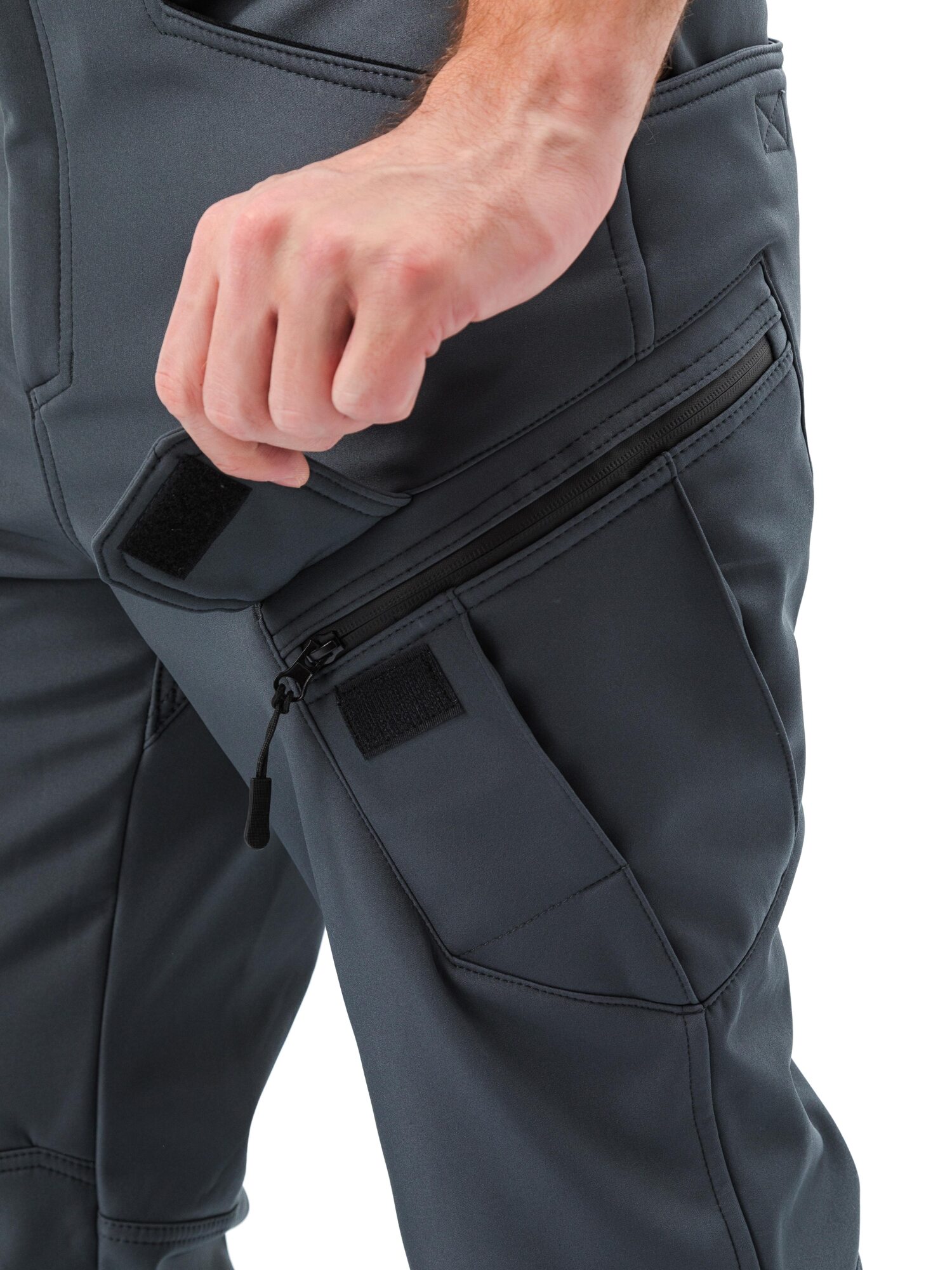 - на боковых сторонах брюк объемные карманы с двумя складками со входом на молнию и ограничителями с двух сторон, замок молнии закрывает декоративный клапан на липучке;