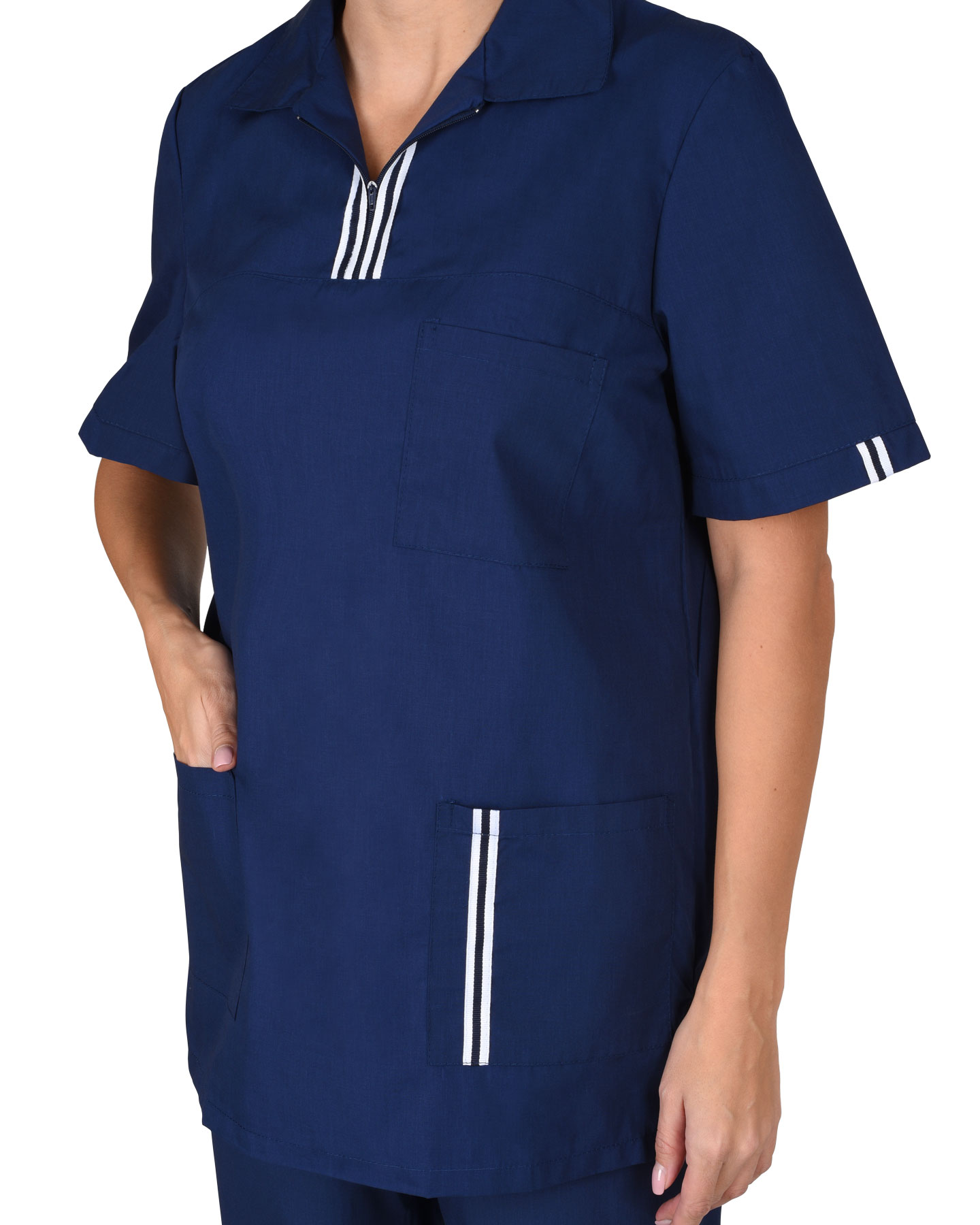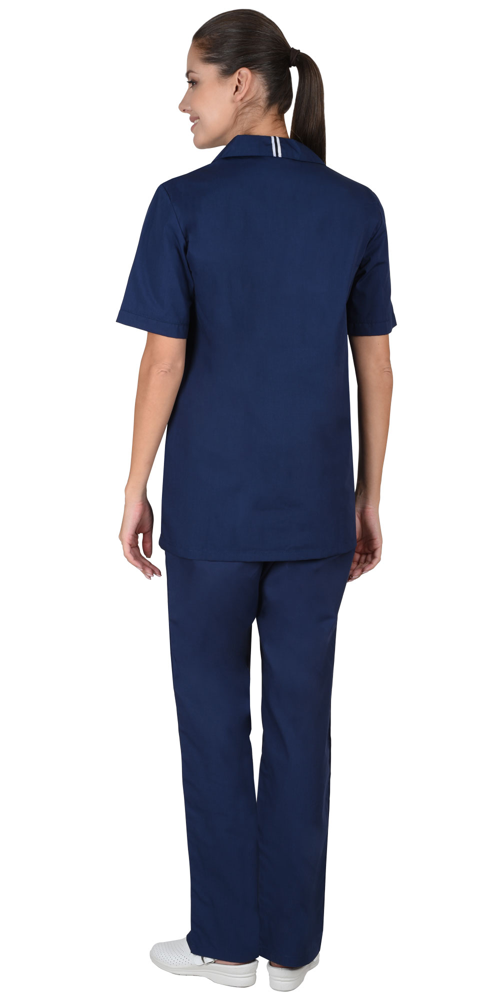 Костюм состоит из блузы и брюк. Блуза прямого силуэта с застежкой на тесьму "молния" в области кокетки. Отложной воротник. Нагрудный левый и два нижних накладных кармана. Рукава втачные, короткие. По низу блузы разрезы в боковых швах.