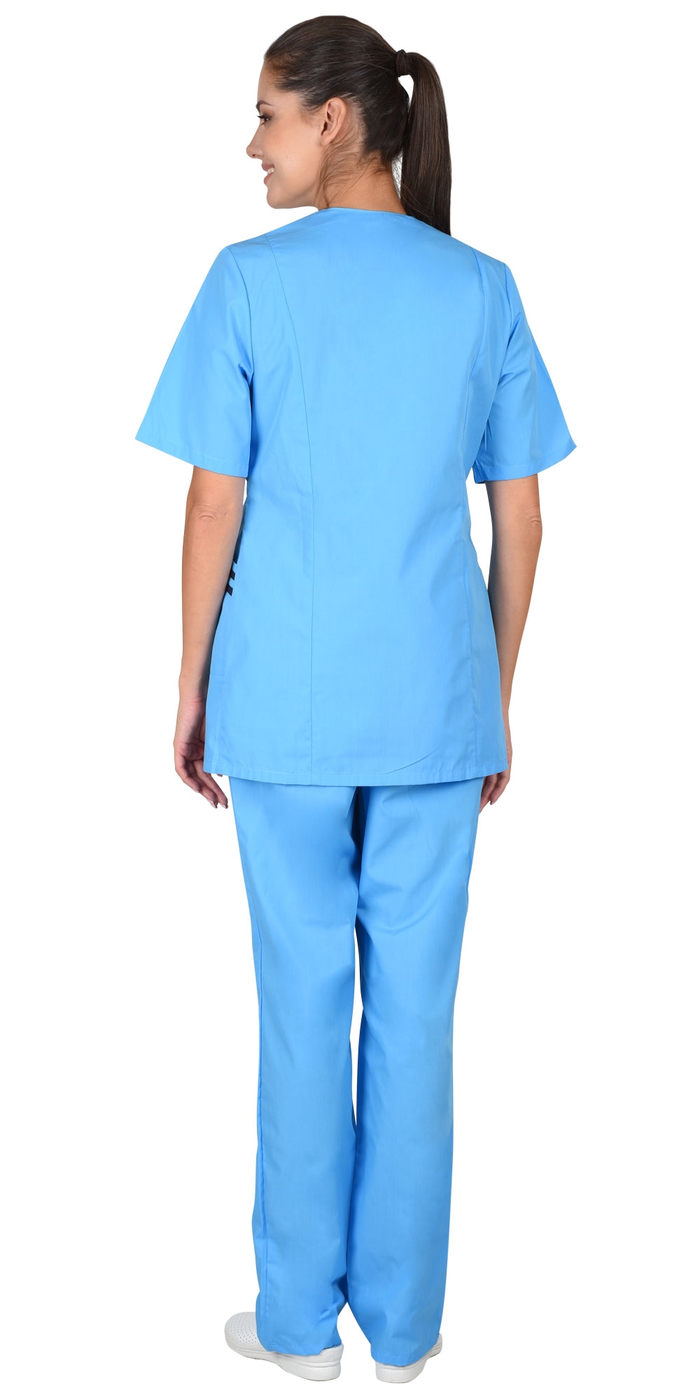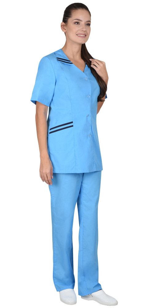 Костюм состоит из блузы и брюк. Блуза приталенного силуэта с застёжкой на пуговицы, короткими рукавами, с отделкой по воротнику и нижним карманам. Брюки прямого покроя без карманов с притачным поясом стянутым резинкой.