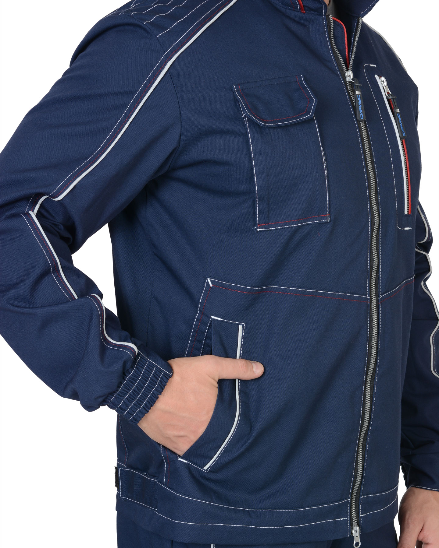 Куртка короткая, воротник стойка; с центральной застежкой на тесьму "молнию"; с внутренней подпланкой; с верхним прорезным карманом на тесьму "молнию" на левой полочке, и с верхним накладным полуобъемным карманом с фигурным клапаном застегивающийся на потайную липучку на правой полочке; с нижними прорезными карманами "листочки", притачной обтачкой низа куртки и манжетами, манжеты частично стянуты резинкой. В куртку предусмотрен СВ кант для обозначения сигнальной видимости