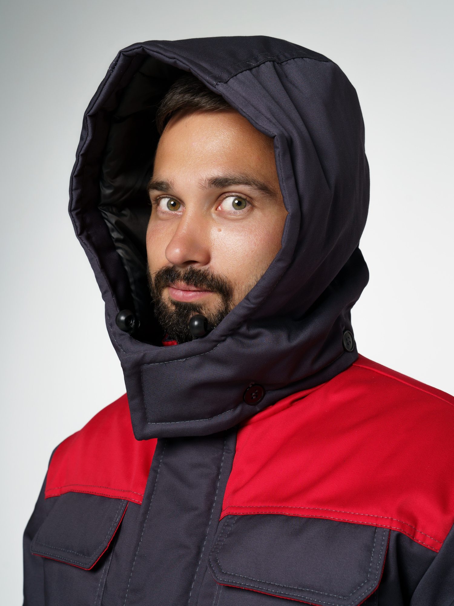 Куртка прямого силуэта, с центральной застежкой на молнию с ветрозащитной планкой на липучках. Нагрудные накладные карманы и нижние объемные накладные карманы-портфель с клапаном на липучках. В рукавах трикотажные манжеты-напульсники. По линии талии кулиса со шнуром-резинкой и фиксатором. Воротник-стойка. Съемный утепленный капюшон на пуговицах, по лицевому вырезу кулиса со шнуром-резинкой и фиксаторами, по лицевой части застегивается на липучки. Подкладка простегана с утеплителем, внутренний накладной карман на левой полочке.