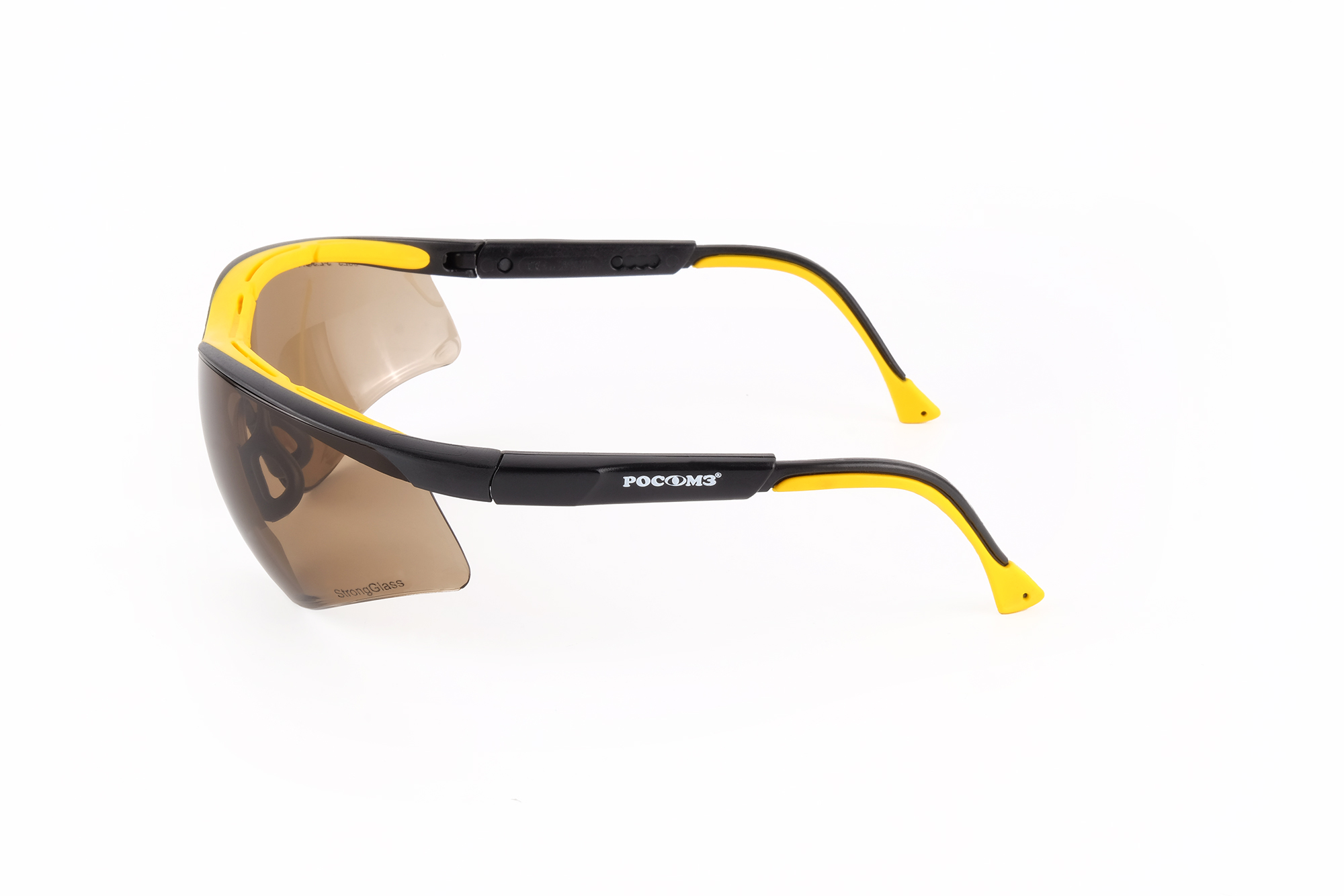 Очки открытые с мягкой вставкой в области лба, двухкомпонентными регулируемыми по длине и углу наклона заушниками с мягкими вставками и мягким носоупором из термо-холодостойкой резины.