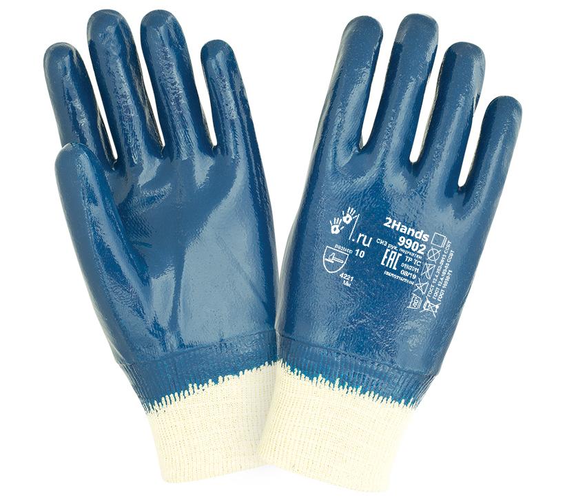 2Hands 9902(Ту Хэндс 9902) для защиты от механических воздействий. Хлопковая основа с полным нитриловым покрытием, манжет резинка. Перчатки 2Hands изготавливаются по специальному заказу  из качественных материалов на современном оборудовании. 100% хлопковая отбеленная ворсистая основа jersey (джерси), специальный состав полимера и технология нанесения покрытия, форма перчатки т.д. обеспечивают высочайшие показатели защиты и комфорта. Перчатки обладают высоким сопротивлением истиранию, разрыву, проколу и порезу, имеют ограниченную стойкость к слабым растворам агрессивных веществ (не обеспечивают защиту от химических рисков  выше 1 кат по EN 374), стойкостью  к контакту с замасленными поверхностями, герметичны.  Отличные гигиенические показали, перчатки 2Hands не содержат вредных веществ, обработаны по технологии Actifresh, входящие в состав перчаток компоненты отвечают требованиям Европейского законодательства по безопасности для пищевых продуктов. Перчатки рекомендованы к применению во всех сферах промышленности для защиты рук при интенсивных механических нагрузках, наличии масляных загрязнений, имеют длительный срок службы, рекомендованы для продолжительного ношения, могут подвергаться многократной промышленной стирке. По результатам производственных испытаний перчатки 2Hands являются лучшим предложением в своем сегменте. Испытания проводились в период 2008-2009 года на предприятиях транспорта, горно-добывающего и нефте-газового комплекса, химической отраслях. Размеры 9(M),10(L), 11(XL).