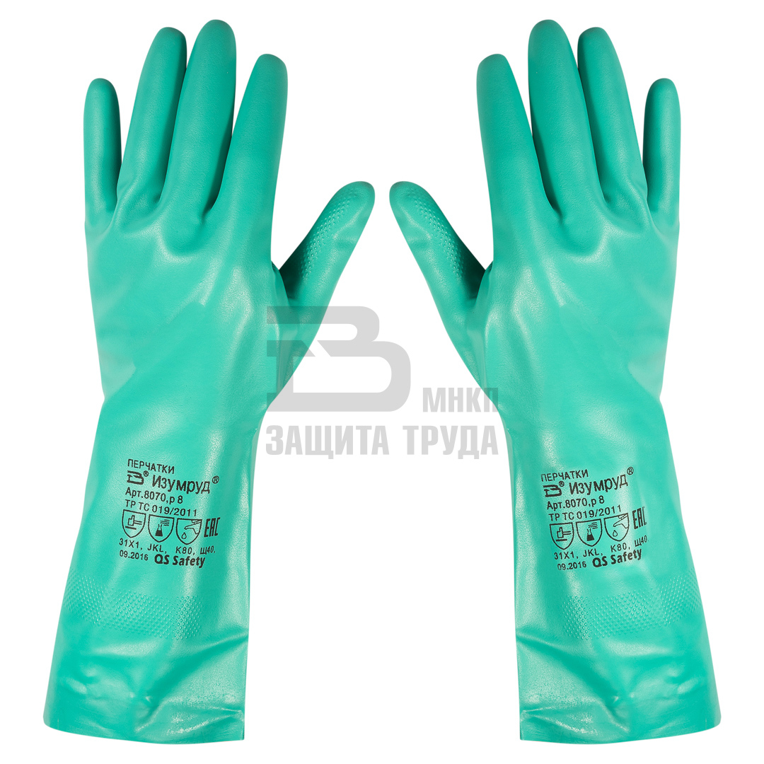 Нитриловые безосновные перчатки с хлопковым напылением зеленого цвета, длина 33 см, толщина 15 мил (0,381 мм), рифленая поверхность ладони и пальцев. Универсальные, недорогие, удобные, надежные перчатки.