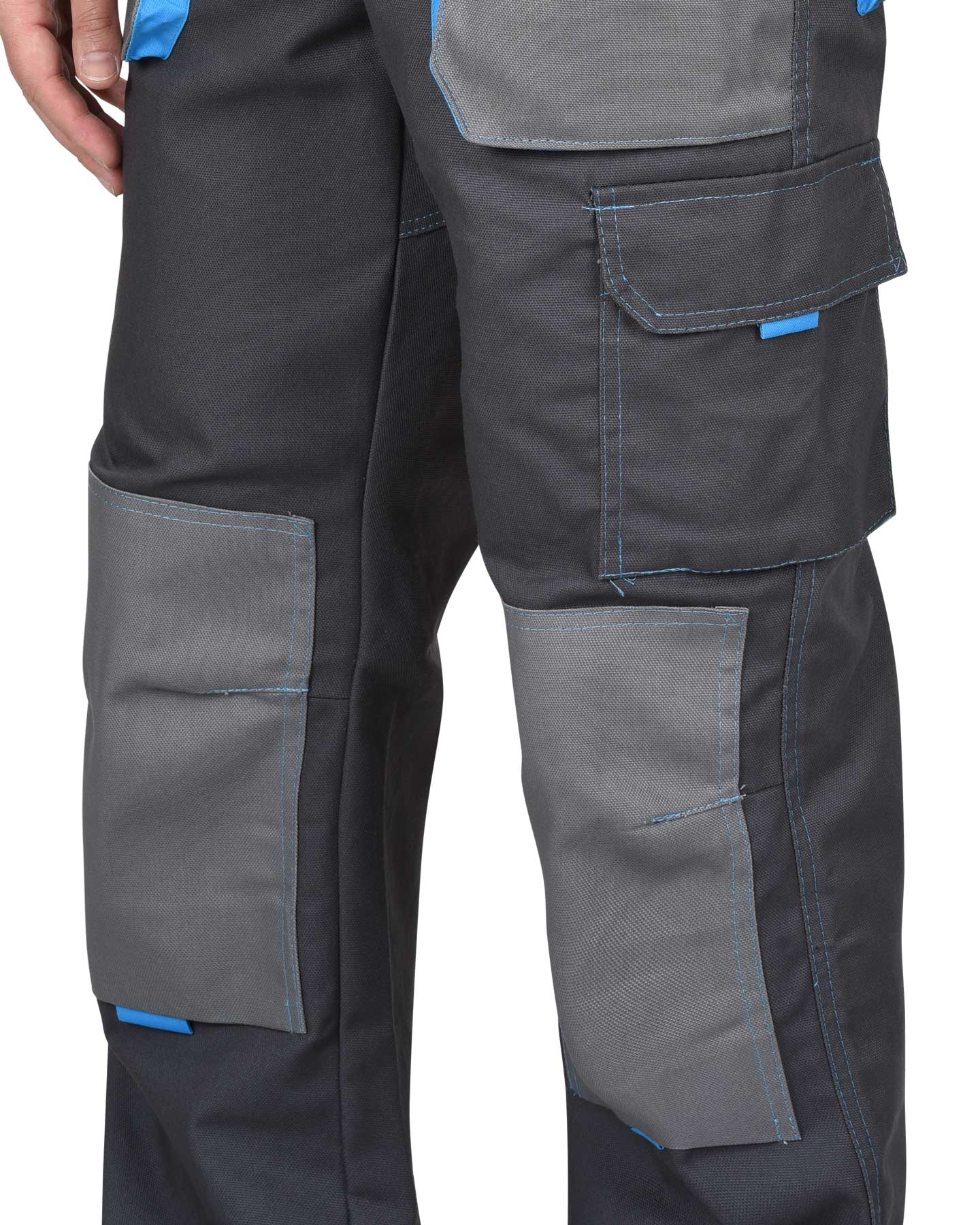 Полукомбинезон выполнен из ткани "Панакота Комфорт", с застежкой гульфика на молнию, застежкой в боковом шве на пуговицы, накладным объемным комбинированным карманом на нагруднике с фигурным клапаном, застегивающимся на липучку. Изделие с нижними боковыми накладными комбинированными объемными карманами с наклонным входом, с накладным объемным карманом и фигурным клапаном на правом боковом шве, застегивающимся на липучку, с объемными наколенниками, с задними накладными объемными карманами и комбинированным карманом для инструмента. В области талии по всей ширине с изнаночной стороны вставлена резинка для лучшего прилегания.