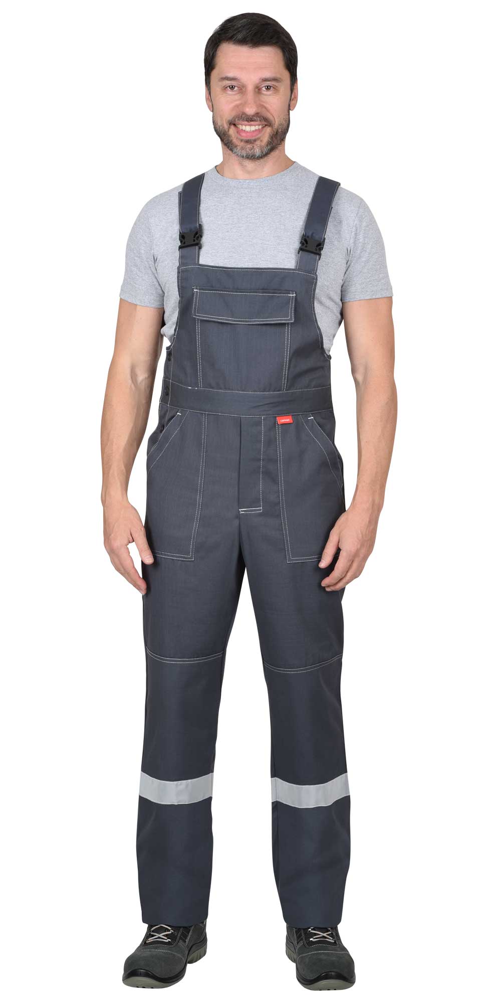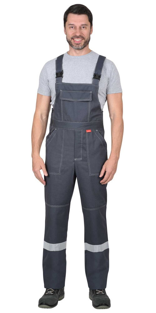 Полукомбинезон прямого покроя, выполнен из ткани "Контакт 250А", с застёжкой гульфика и застёжкой в правом боковом шве на 3 пуговицы, с карманом и клапаном на нагруднике, застегивающимся на липучку. Бретели регулируются при помощи пряжек - фастексов и резинки помочной. Брючины с боковыми накладными карманами с наклонным входом и наколенниками. По низу полукомбинезона предусмотрена лента светоотражающая (мелкодисперсная белая) 50 мм для обозначения сигнальной видимости.