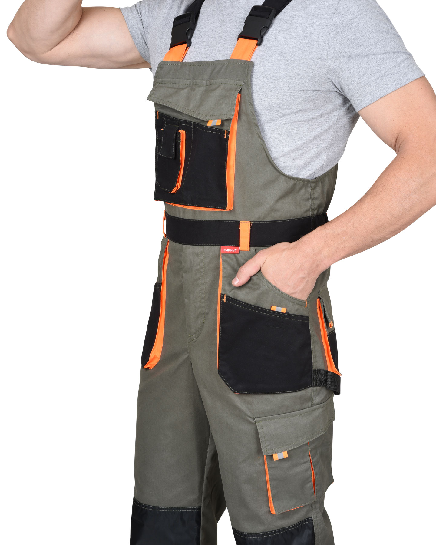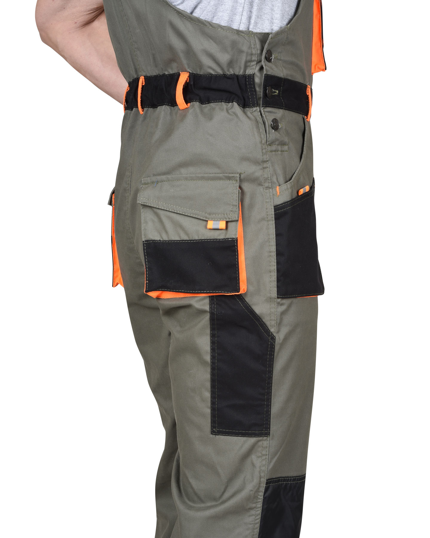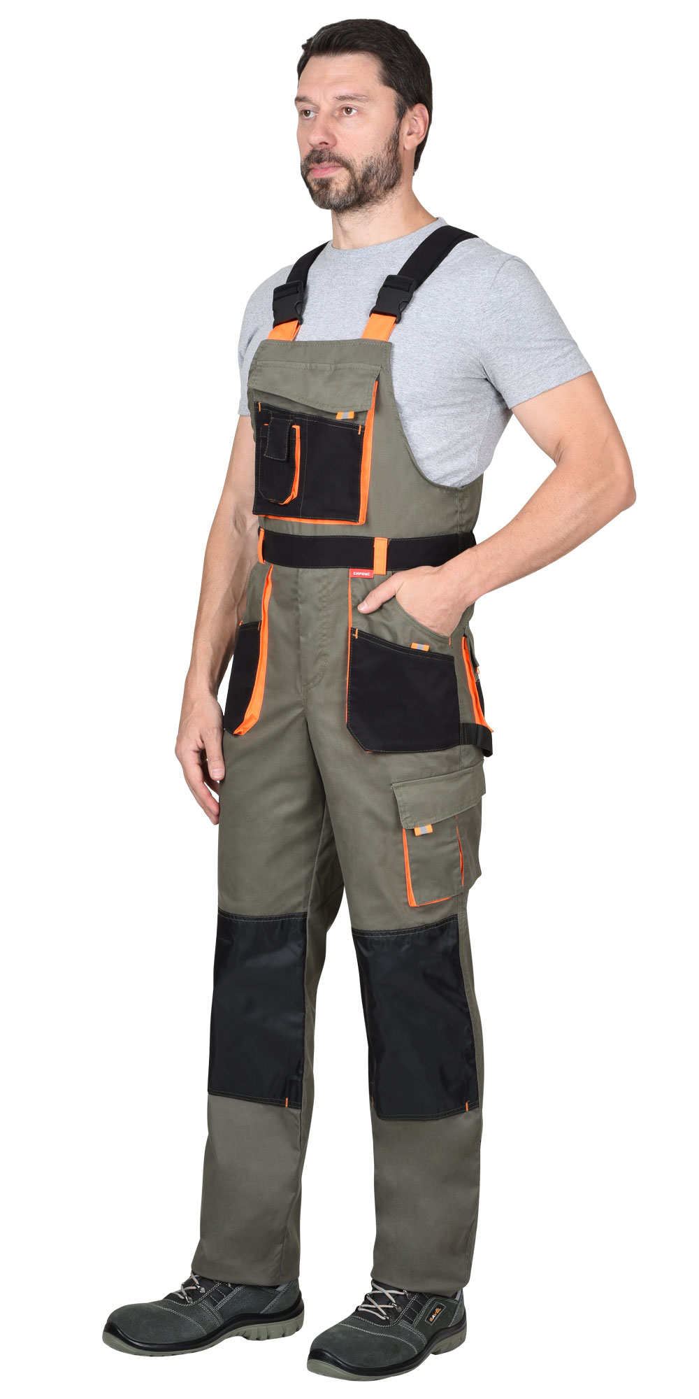Полукомбинезон с застежкой гульфика на «молнию» и с застежкой в правом боковом шве на три петли и три пуговицы , с нагрудным накладным большим и малым карманом и карманом для телефона, с боковыми внутренними карманами, с накладным карманом на левом боковом шве с клапаном на липучке, с наколенниками, с двумя задними карманами с клапанами , и карманом для инструментов, по спинке вставлена резинка.