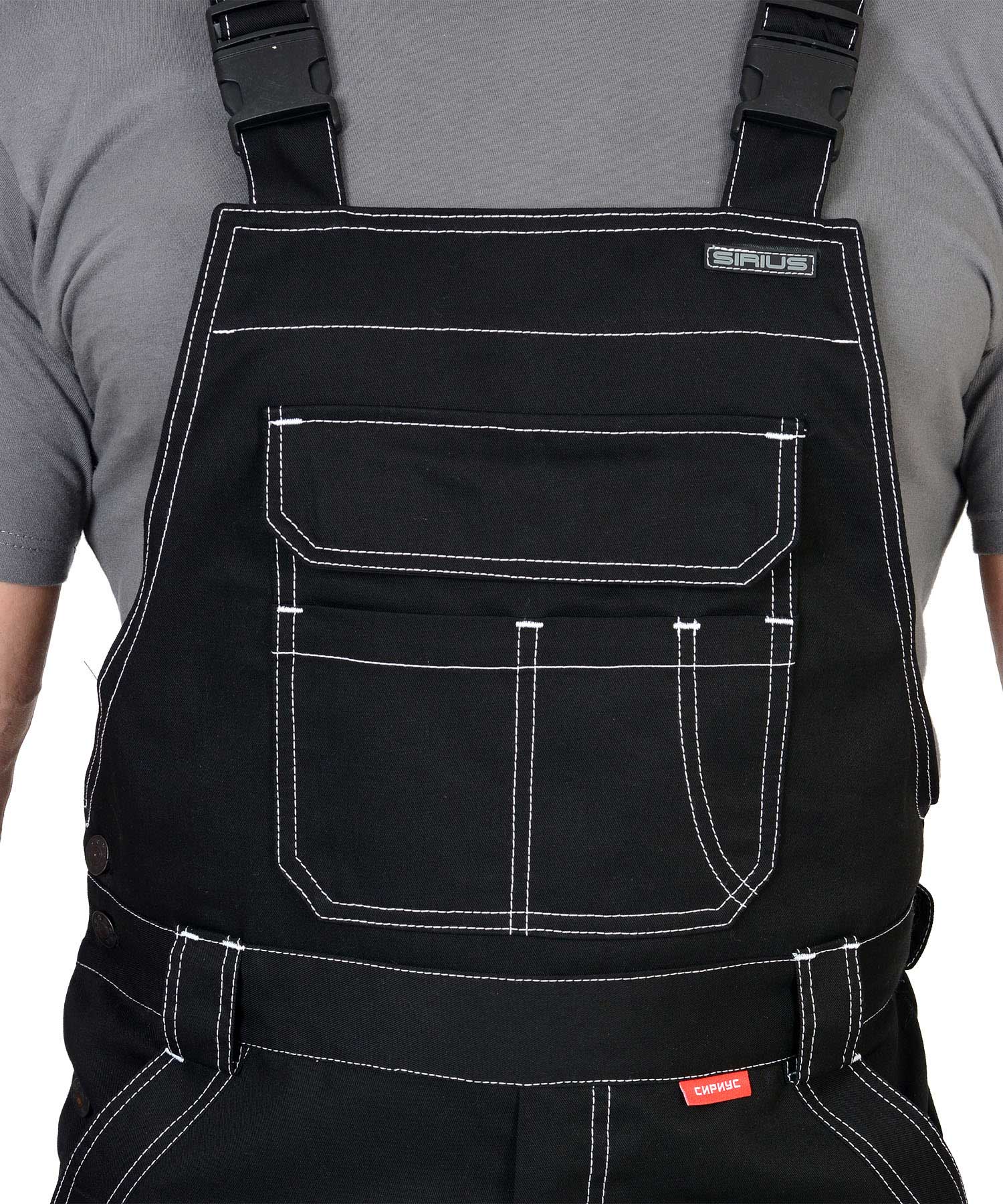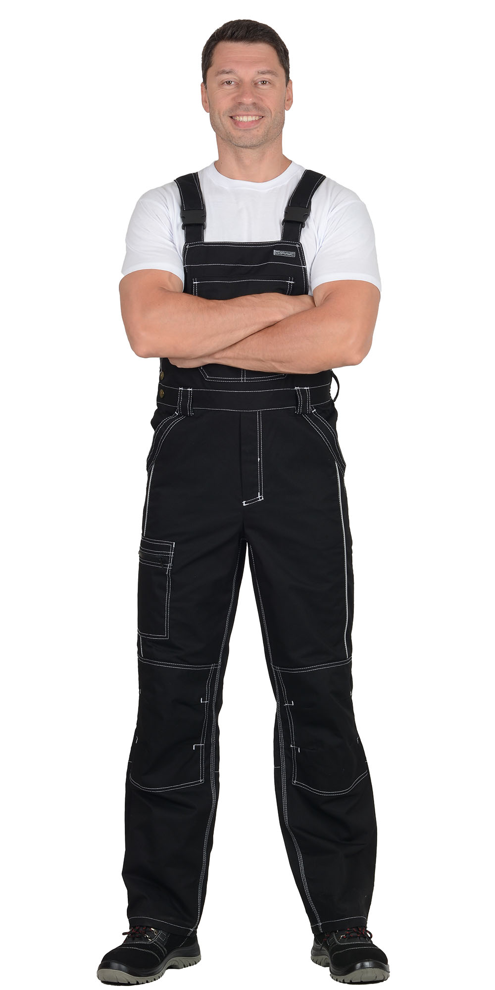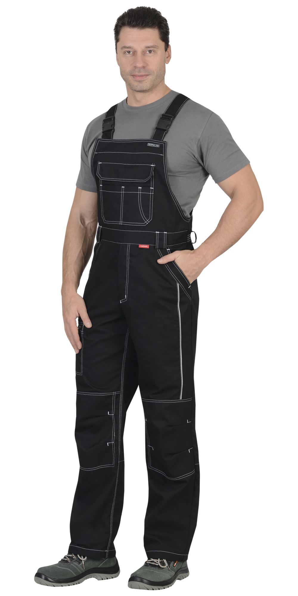 Полукомбинезон прямого силуэта, застежкой гульфика на молния, с различными многофункциональными карманами, с застежкой в правом боковом шве на пуговицы, с наколенниками, с бретелями регулируемыми эластичной тесьмой и фастексами, с эластичной тесьмой по линии талии, на передних половинках в рельеф вшивается СВ кант.