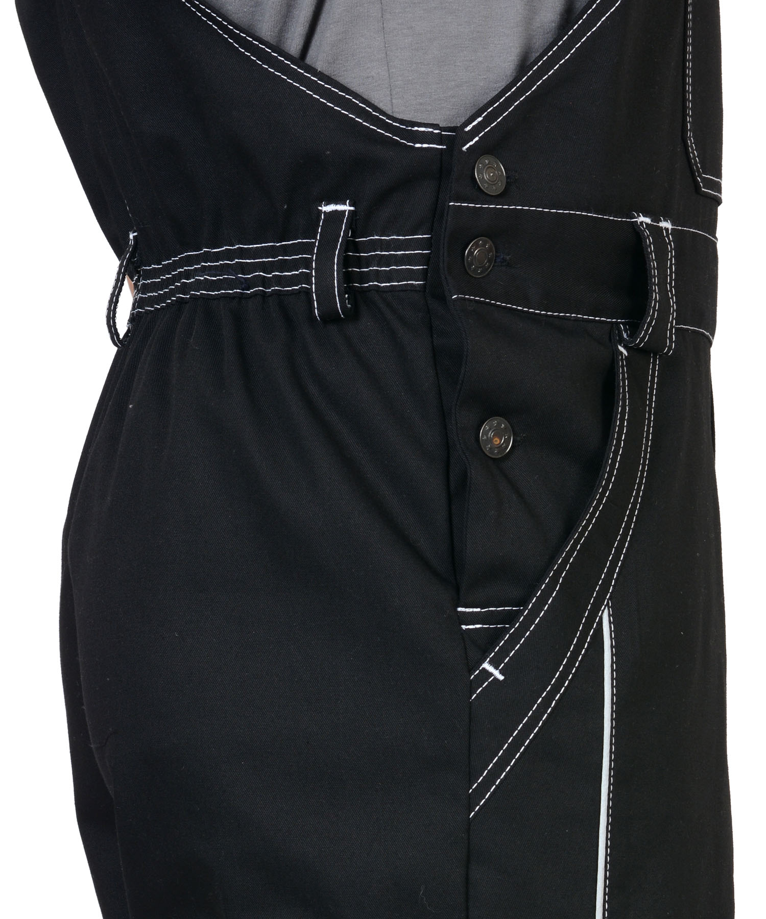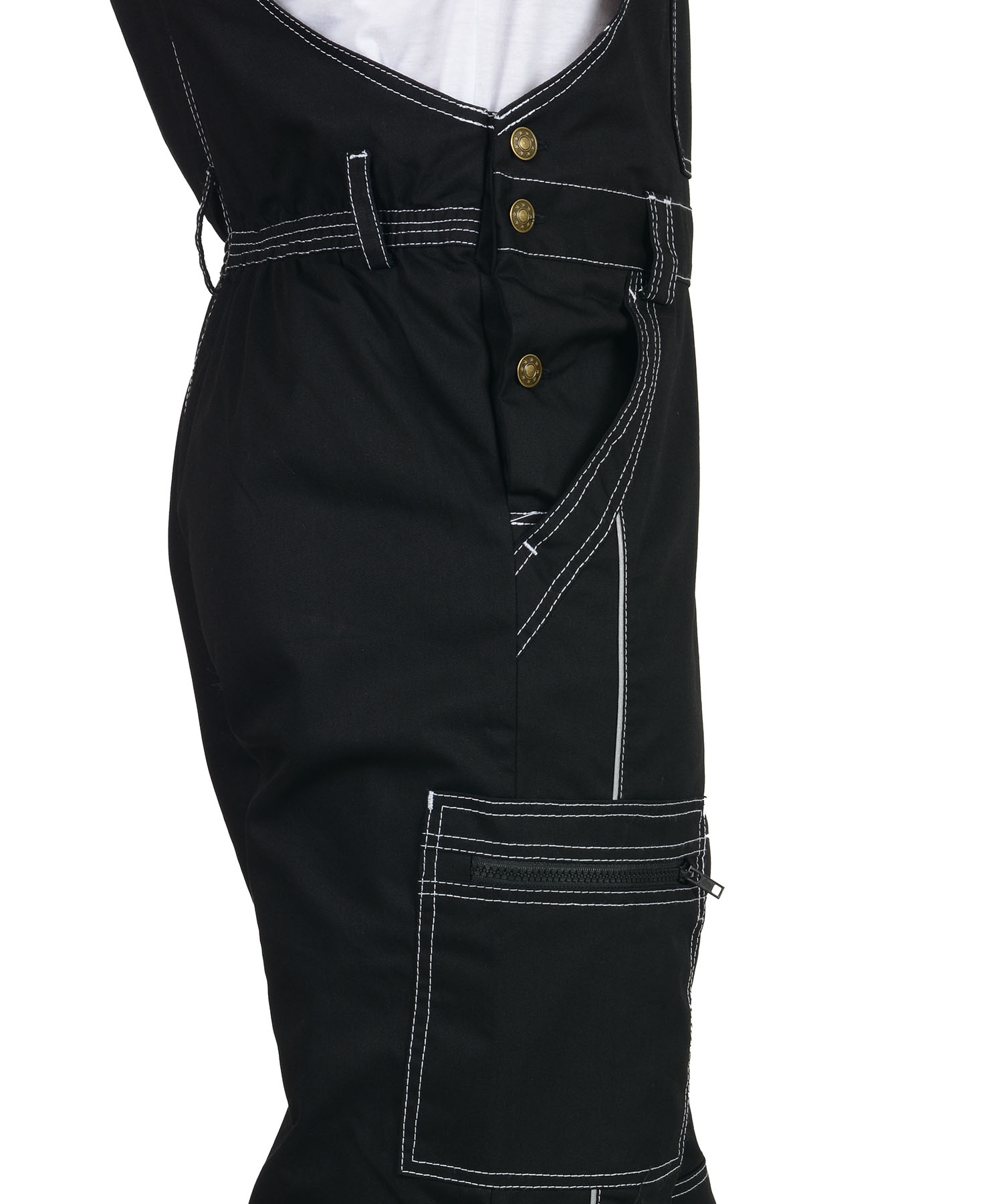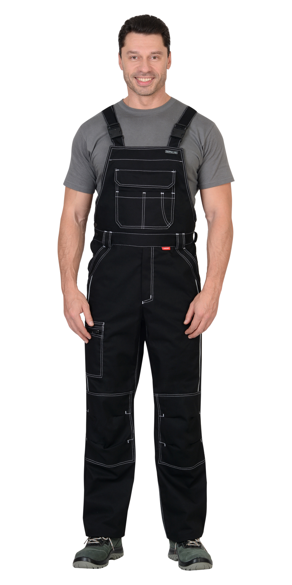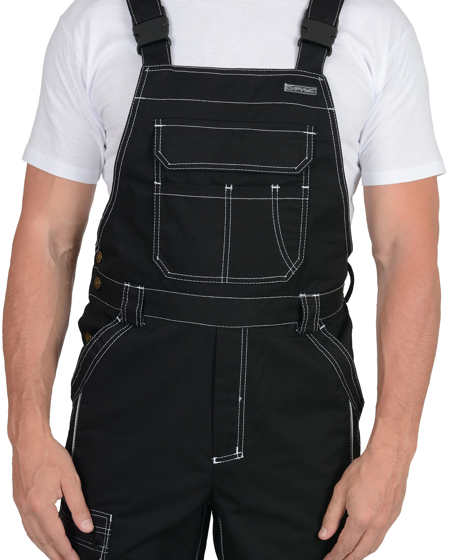 Полукомбинезон прямого силуэта, застежкой гульфика на молния, с различными многофункциональными карманами, с застежкой в правом боковом шве на пуговицы, с наколенниками, с бретелями регулируемыми эластичной тесьмой и фастексами, с эластичной тесьмой по линии талии, на передних половинках в рельеф вшивается СВ кант.