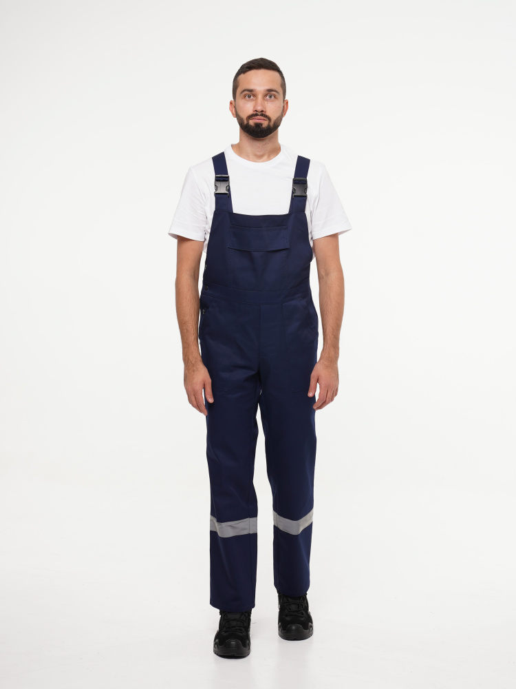 Полукомбинезон прямого покроя, с застёжкой гульфика и застёжкой в правом боковом шве на пуговицы, с карманом и клапаном на нагруднике, с боковыми накладными карманами и карманами для инструментов.