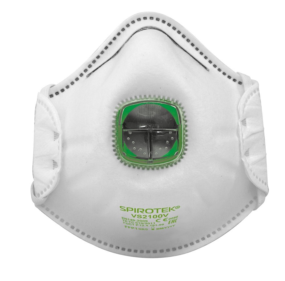 Противоаэрозольная фильтрующая полумаска Spirotek VS2100V, NR, класс защиты FFP1 (до 4 ПДК), чашеобразной формы, с алюминиевым носовым зажимом, клапаном выдоха Тайфун, оснащена фильтром электростатического действия, с внутренним слоем и регулируемыми ремнями оголовья из гиппоалергенных материалов. Обеспечивает высокоэффективную защиту органов дыхания от различных видов аэрозолей. Конструкция клапана выдоха Тайфун уникальна, разработана для максимально эффективного отведения тепла и влаги из-под маски. Цветовая индикация (""принцип светофора"") для определения класса защиты. Пройден доломит-тест, можно использовать в условиях высокой запыленности. Чашеобразная форма - удобная, привычная многим пользователям форма. Уплотняющий материал по всему периметру гарантирует плотное и комфорное прилегание к лицу. Многослойный фильтрующий материал с высоким качеством фильтрации обеспечивает низкое сопротивление дыханию.