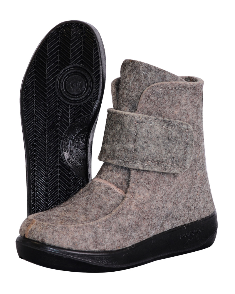 Модель имеет удобный хлястик, который обхватывает ногу, так что можно регулировать полноту голени. Застежка на липучке позволяет легко надевать и снимать валенки.