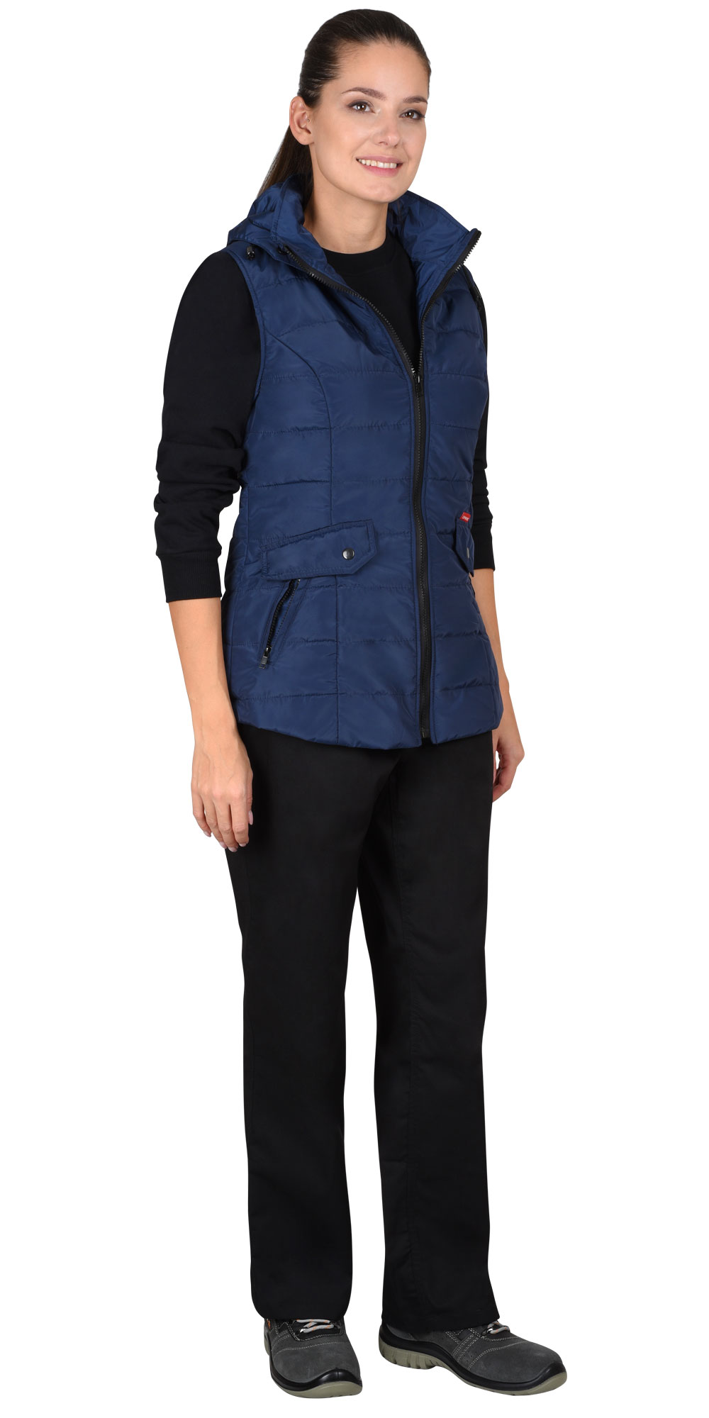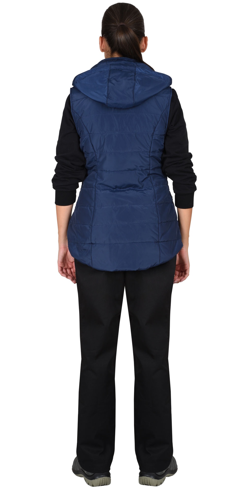 Жилет женский, утепленный, полуприлегающего силуэта, с центральной застежкой на молнию, с воротником стойкой и съемным капюшоном, пристегивающимся с помощью пуговиц и кнопок. Капюшон регулируется с помощью кулисы со шнуром. На полочках расположены карманы с наклонным входом на молнию, вход в карманы частично прикрывается фигурными клапанами на кнопке. Пройма с эластичной тесьмой для лучшего прилегания. Низ жилета фигурный.